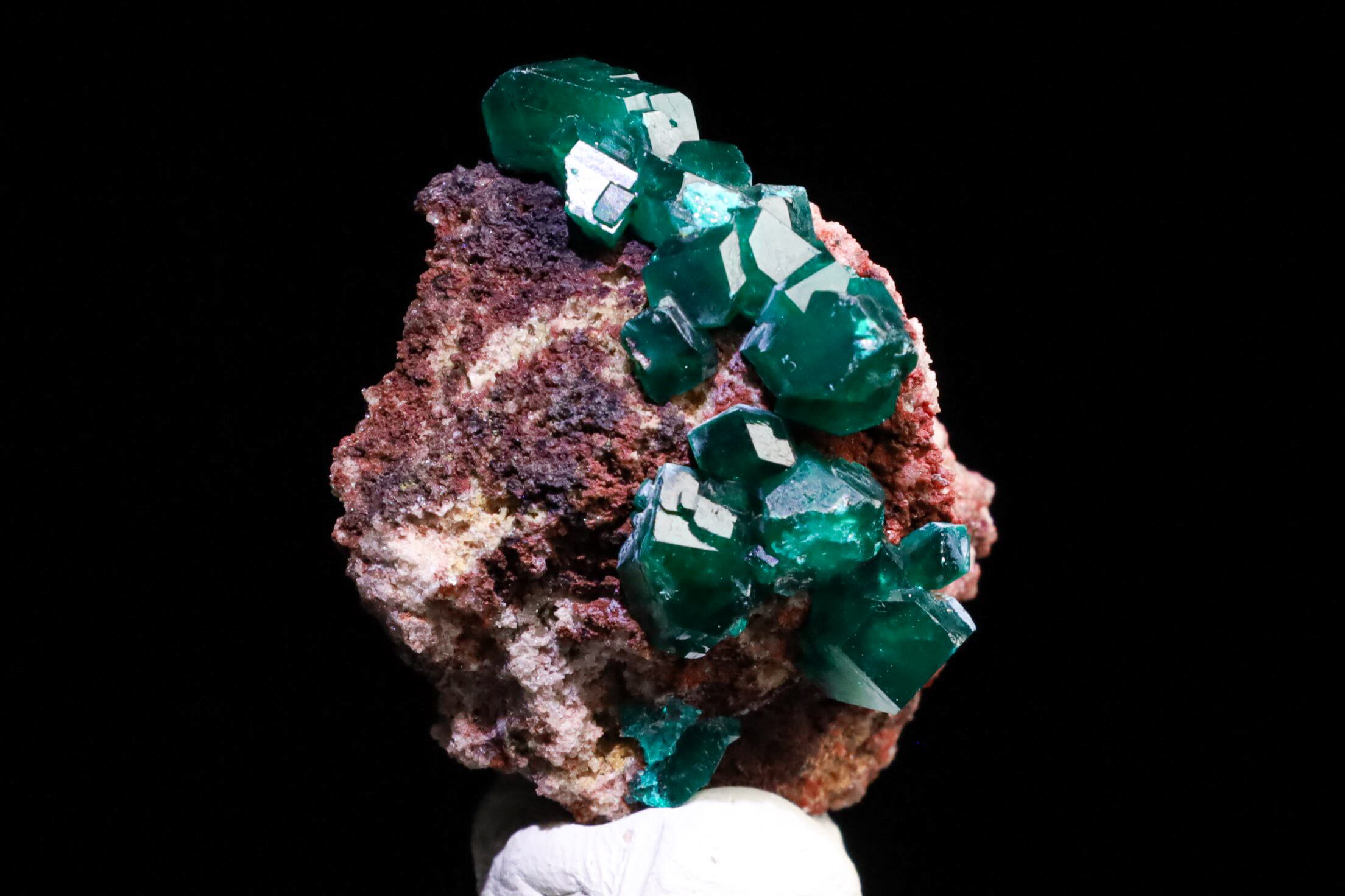 こちらはアフリカ中部、コンゴ民主共和国のコルウェジ(Kolwezi)鉱山地域で採掘された、ダイオプテーズです。コルウェジは、約10億年前に形成された中央アフリカ銅帯(Central African Copperbelt)に位置し、豊富な銅資源と多様な二次鉱物で知られる世界有数の鉱物産地のひとつです。