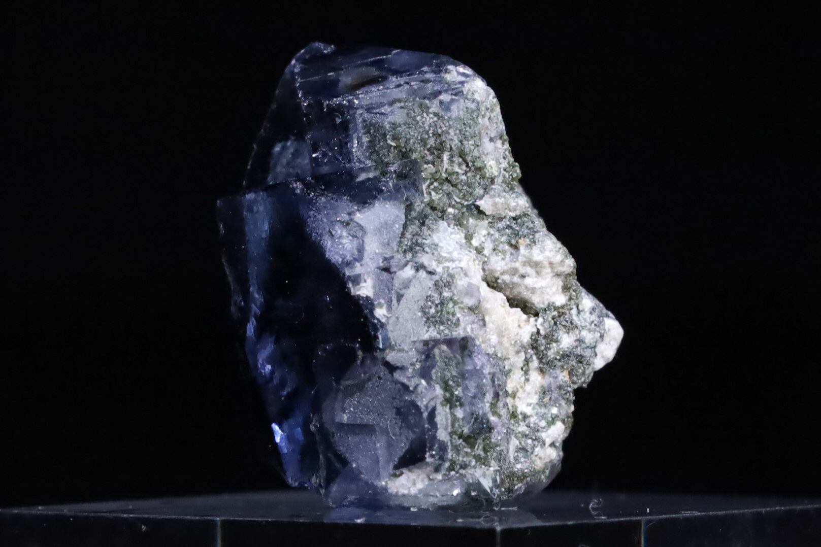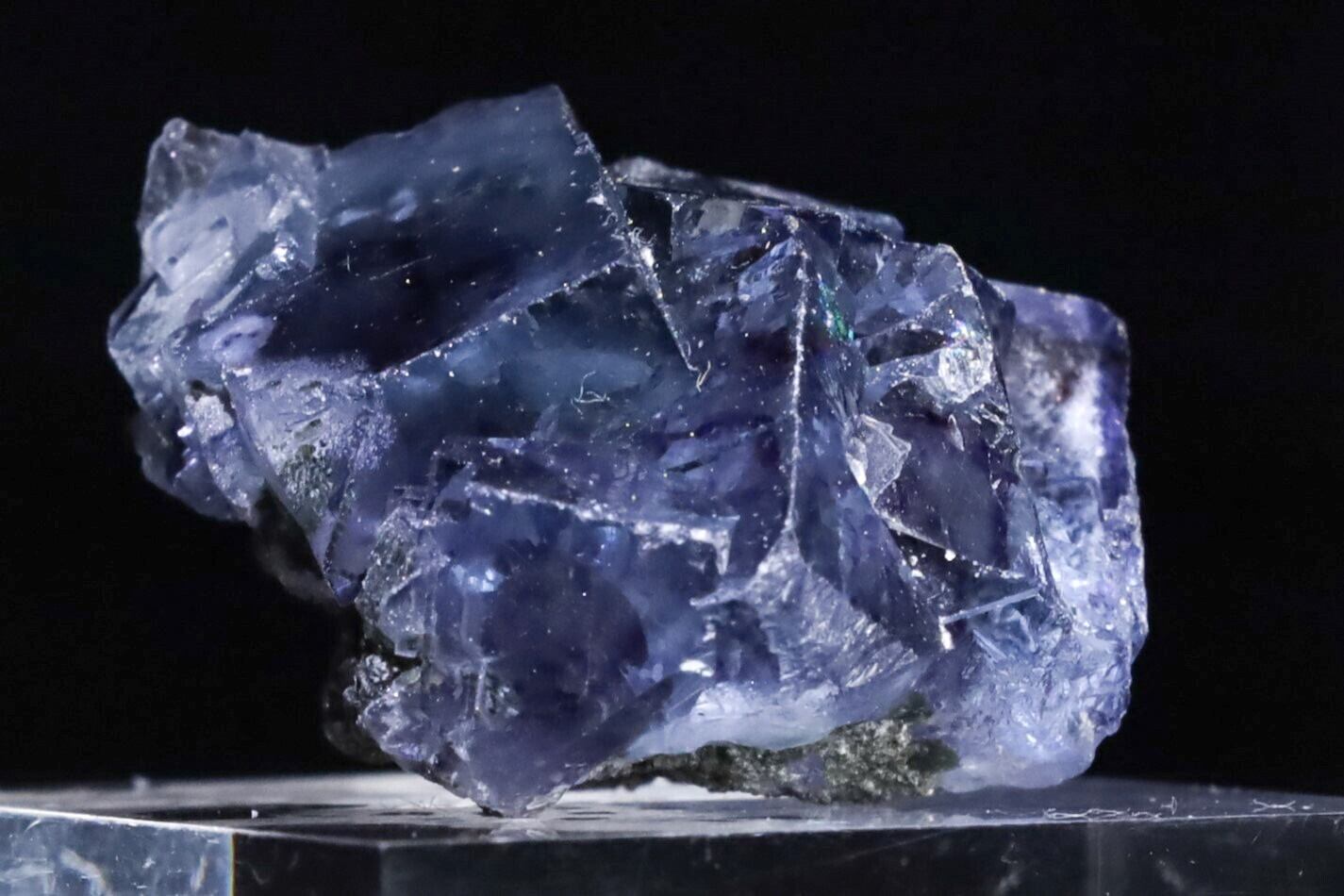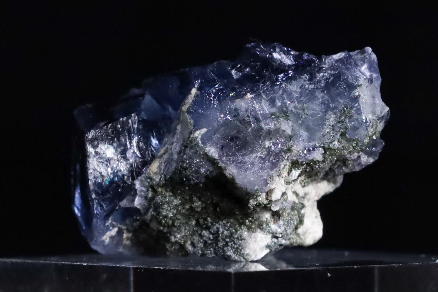 ダメージが少しあるものの、パープリッシュブルーともブルーイッシュパープルとも言える綺麗な色味の、幾何学的造形が美しいヤオガンシャン産のフローライトです。光源との距離や角度によってパープル感や青味などの色味の変化が綺麗で、画像での忠実な再現が少し難しかったですが、通常光下の感じは2枚目の画像でイメージしていただけましたら問題ないかと思います。