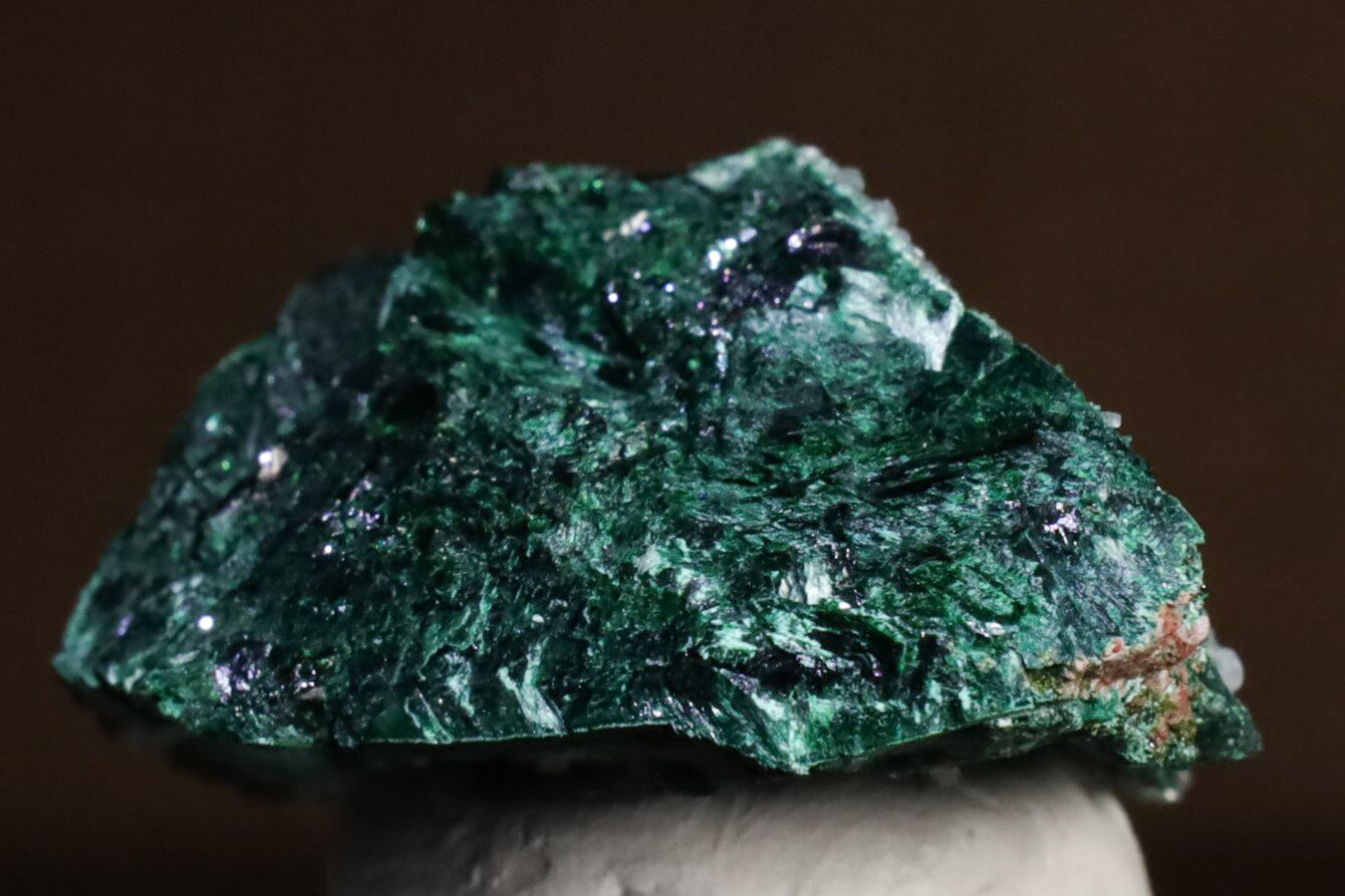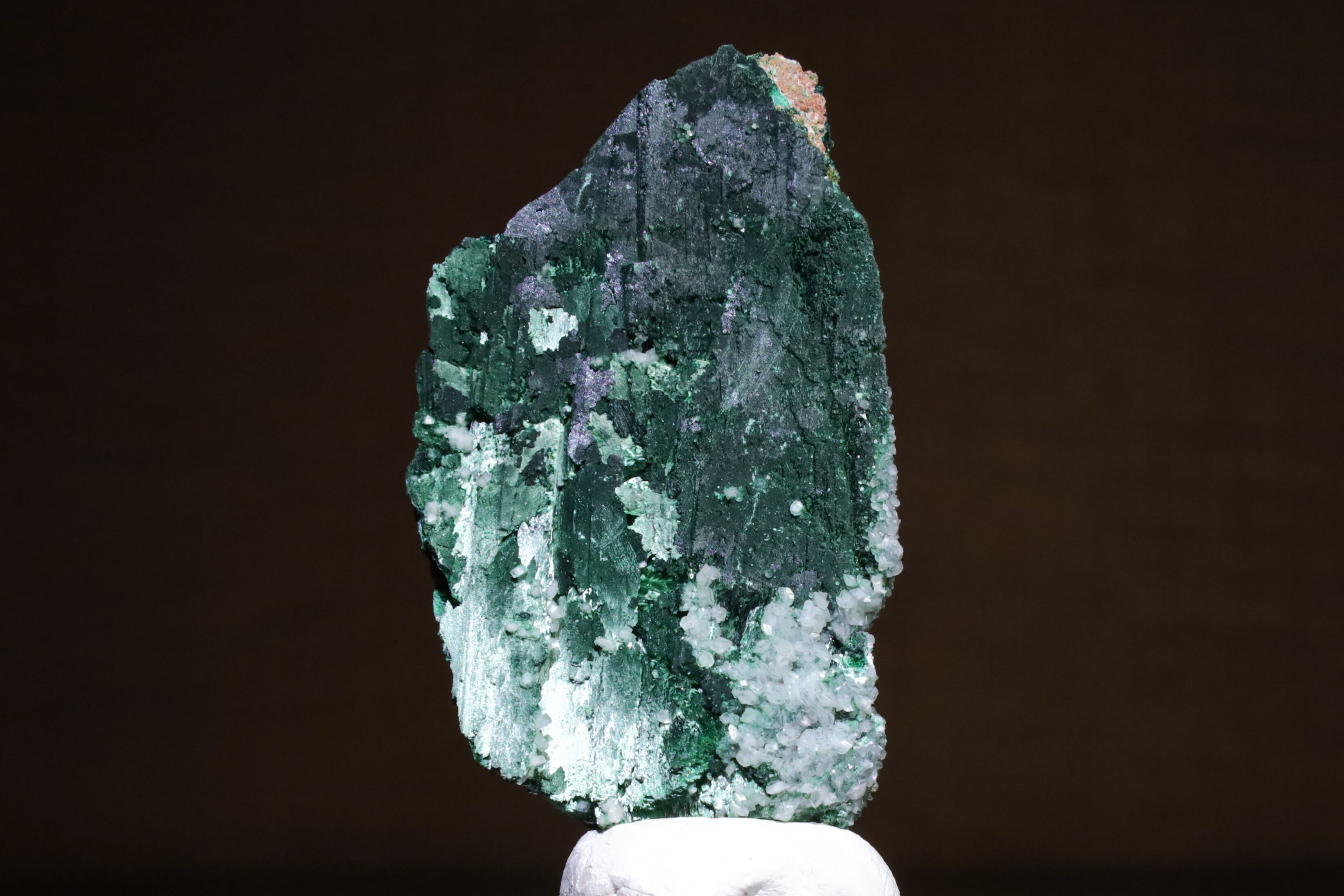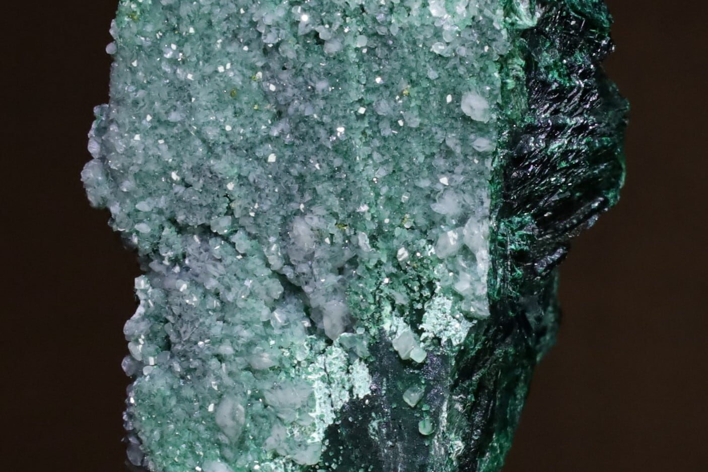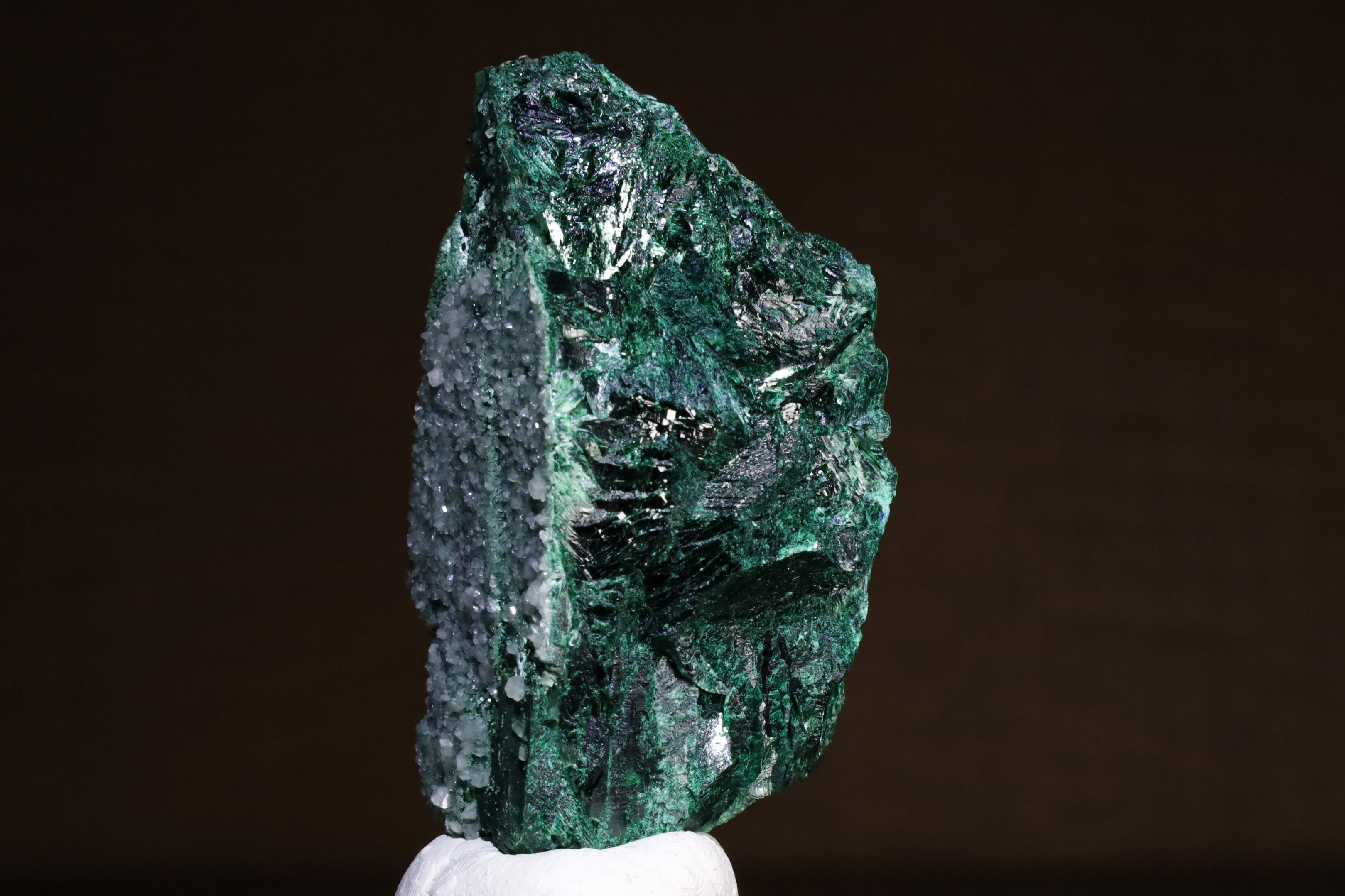 ナミビアにある世界で最も有名な鉱山の一つ、Tsumeb Mineからの、ギラギラ感が美しい元々はアズライトとして形成されたものが後にマラカイトに置き換わり、その上のキラキラしたドロマイトがオンした美術品のような共生結晶です。3枚目の左下や4枚目の右側などの白い部分は実際は光沢で、全体的にメアタリックな光沢がどの角度からも見られ、実際にはドロマイト以外に白い部分はありません。