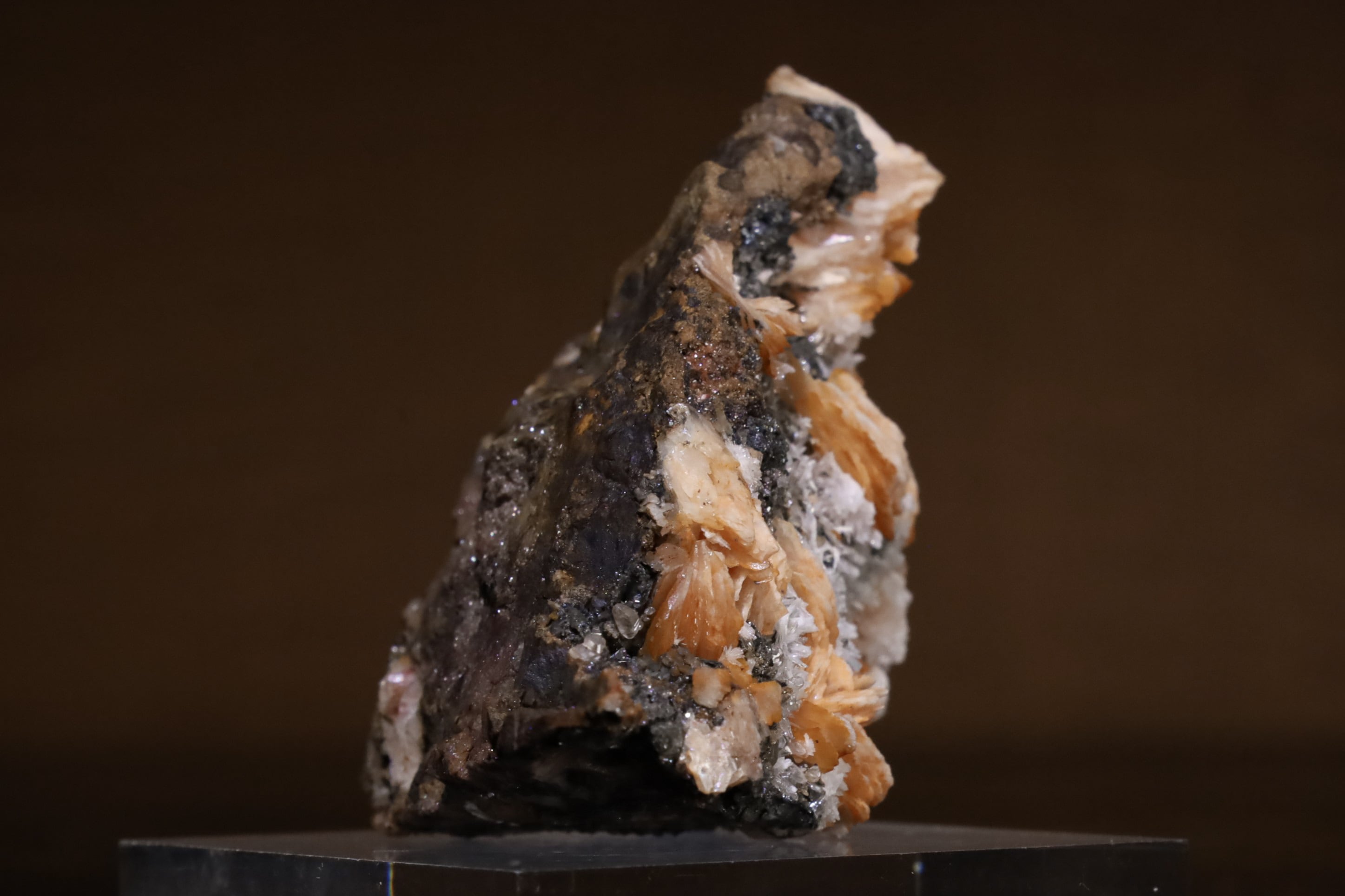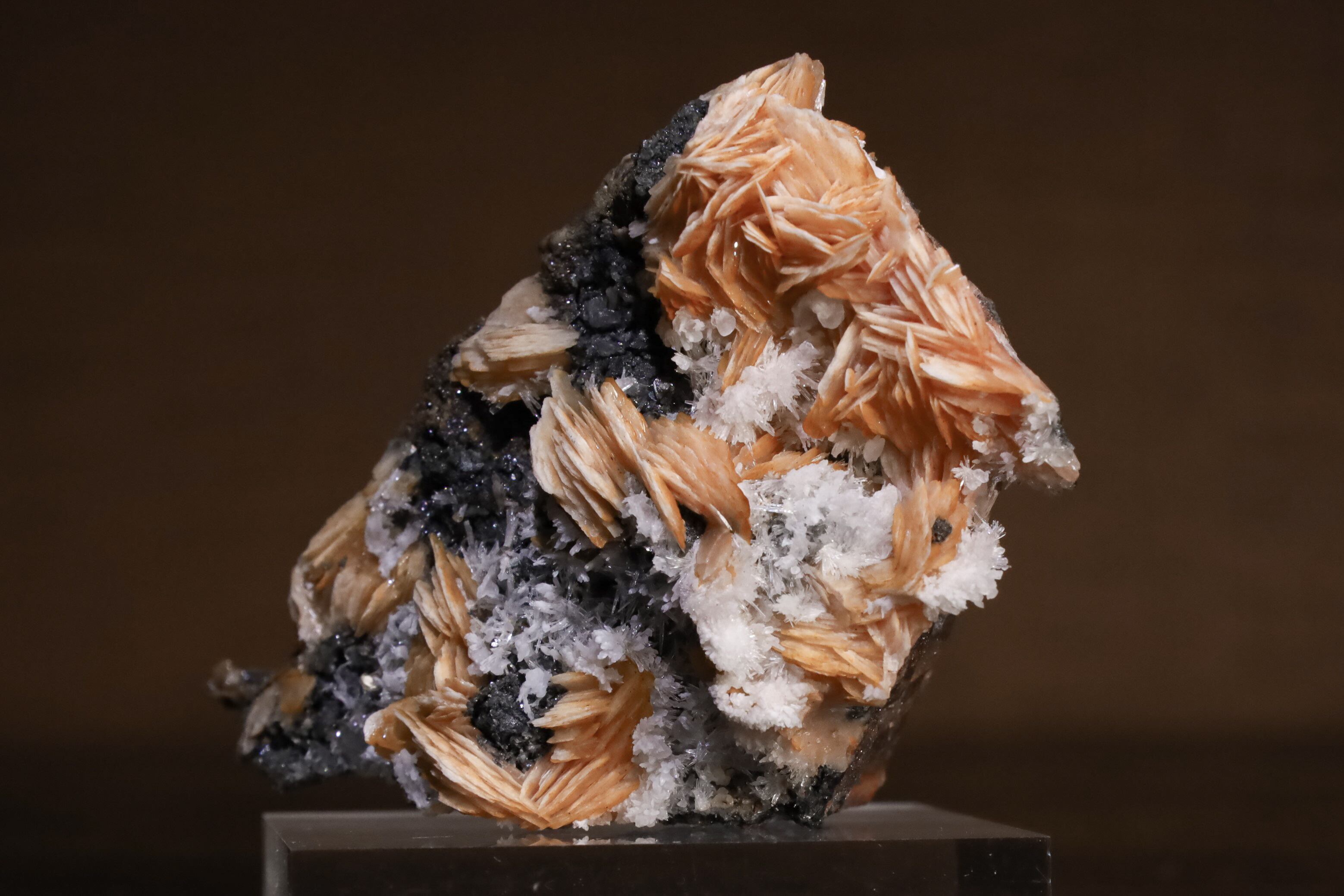 こちらはモロッコ、Mibladen産の、鮮やかなオレンジ色のバライトが花びらのように広がるクラスターと、白いアラゴナイトが繊細に寄り添う、印象的な鉱物標本です。