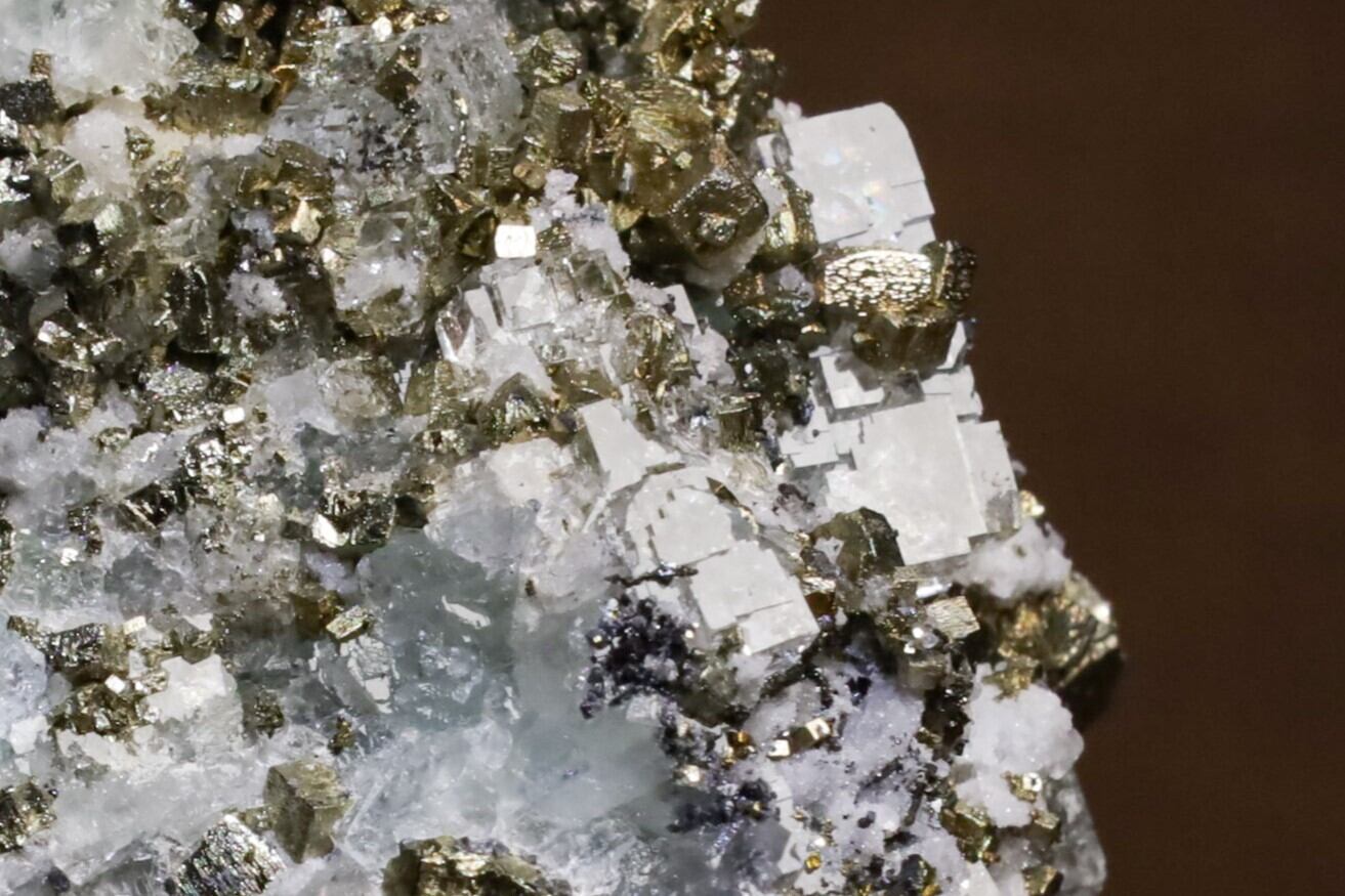 そんなアンデス山脈の、壮絶な大地の営みの結晶そのものであるコチラでは、ミラクル・クラスターの中、パイライトの無数の輝きや、光源との角度によってはメイン画像のような、フローライトの幾何学的造形もみられます。また、画像にはありませんがブラックライトを使用すると、綺麗なパープルの蛍光性もみられます。
