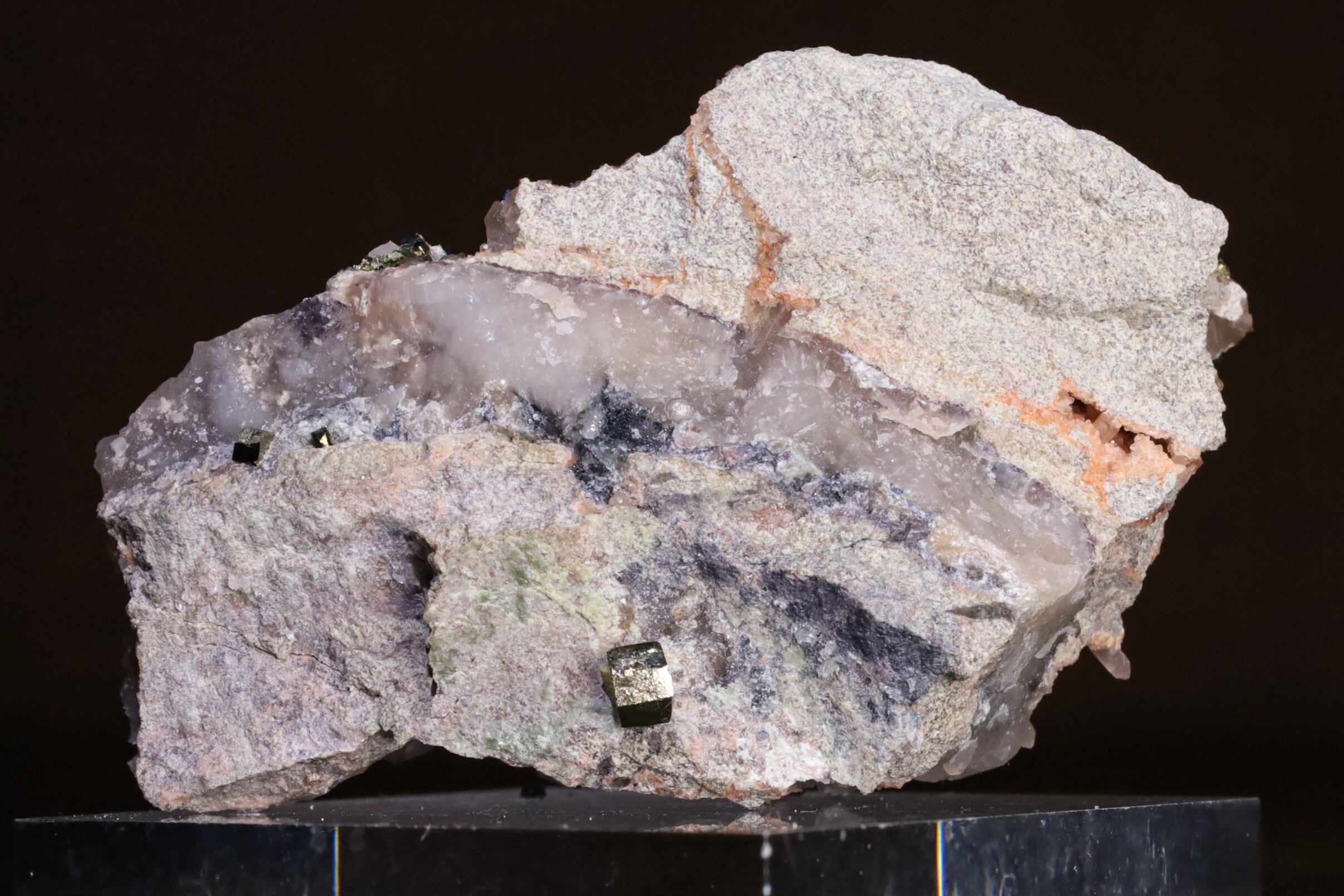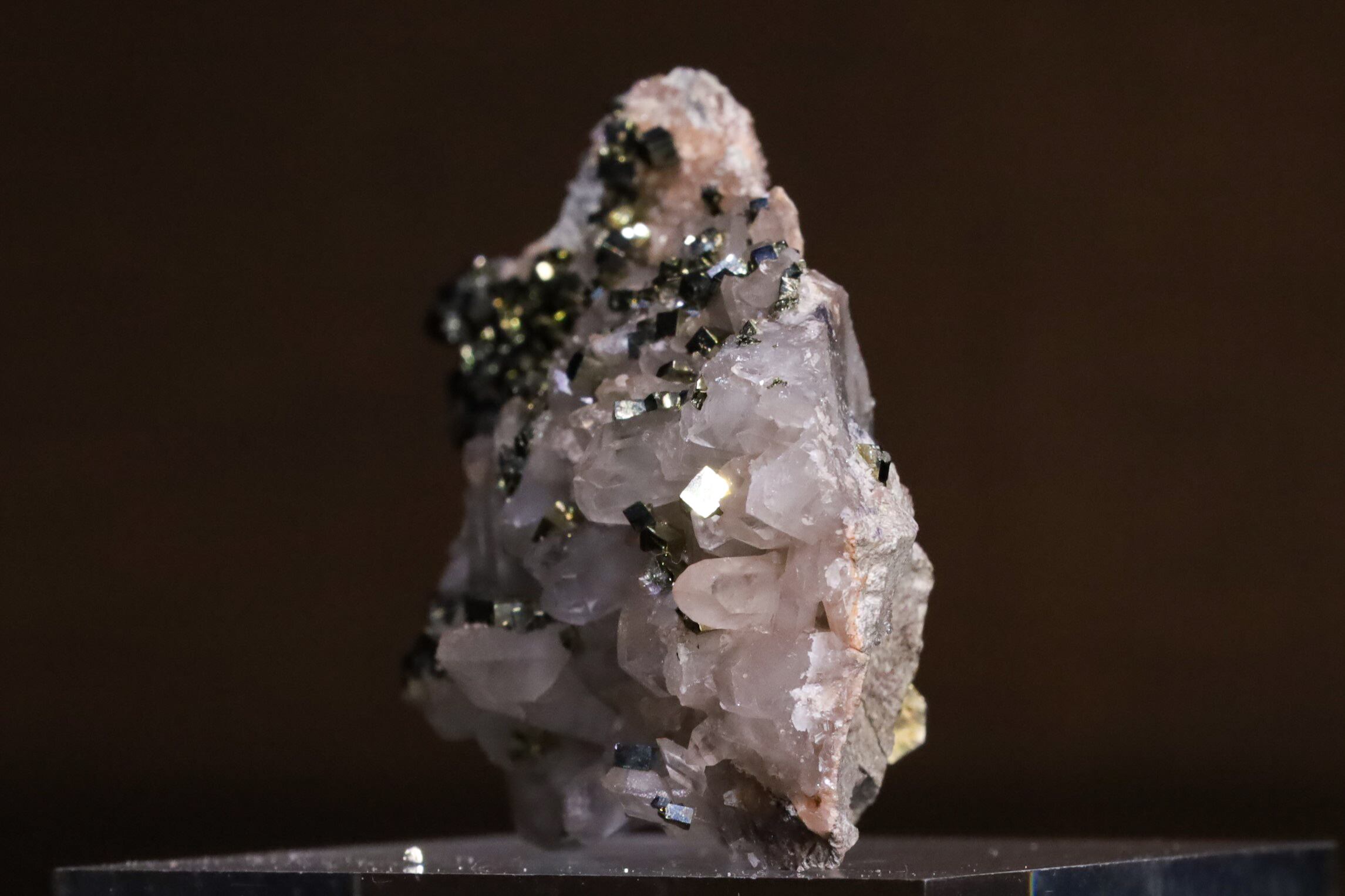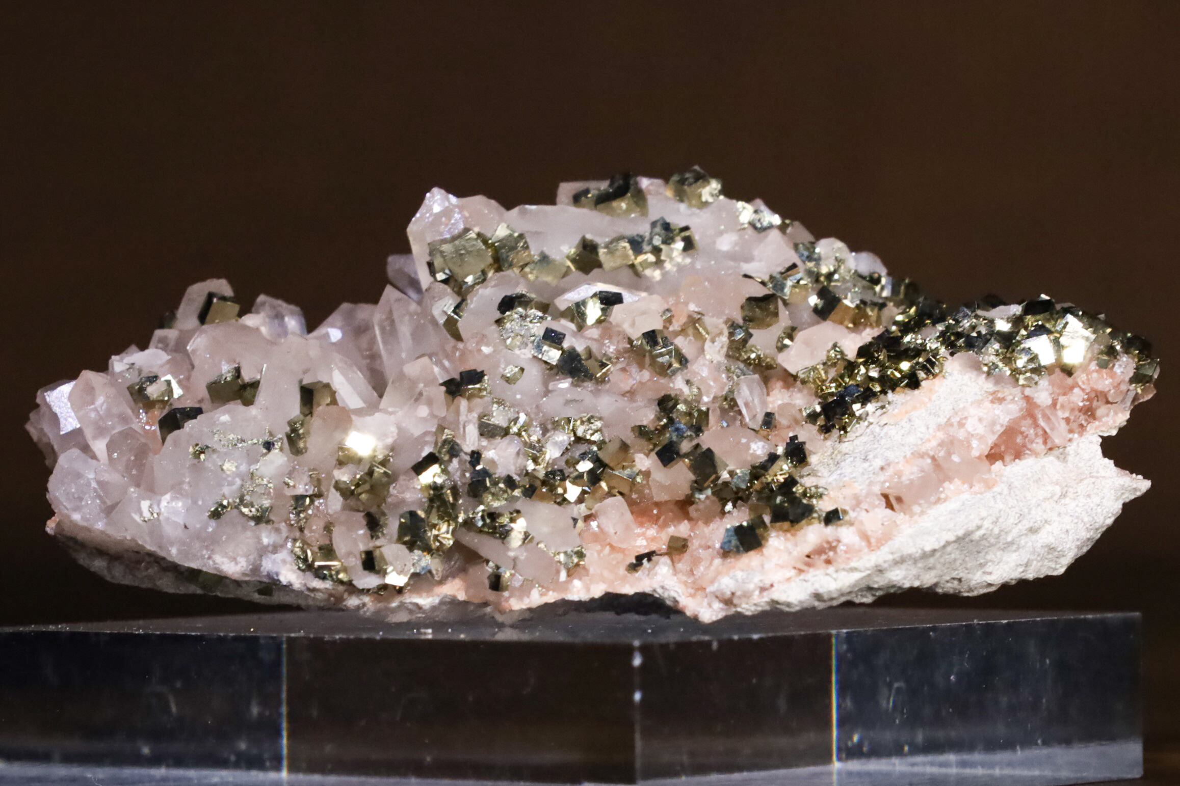 こちらは南アフリカ・北ケープ州、Orange River Areaから採取された、輝くパイライトがクォーツを彩る美しい共生標本です。Orange River Areaは古代にわたる地殻活動と水の作用により、鉄分を含む熱水が流入し、鉱物が再結晶化した地質的に特異な場所として知られています。