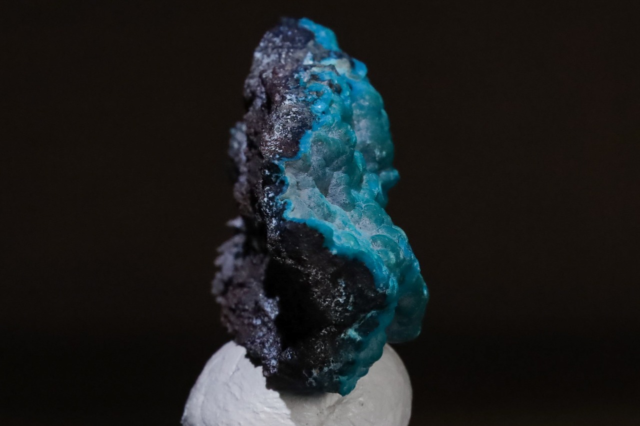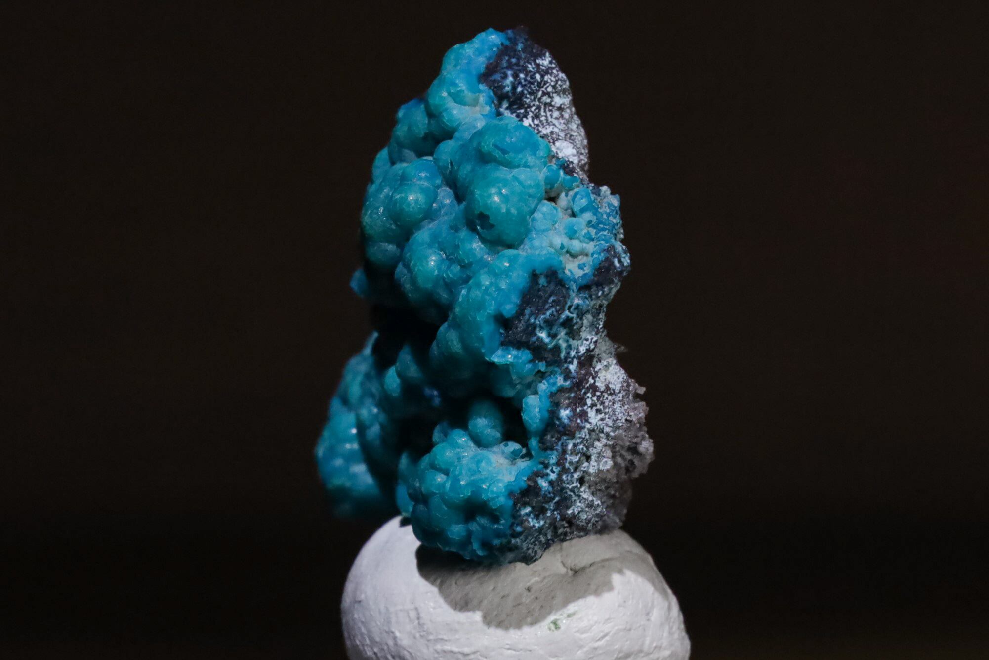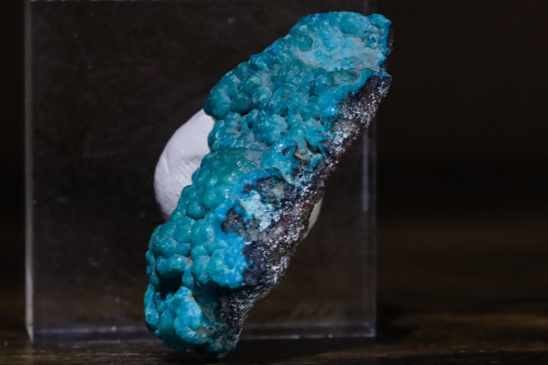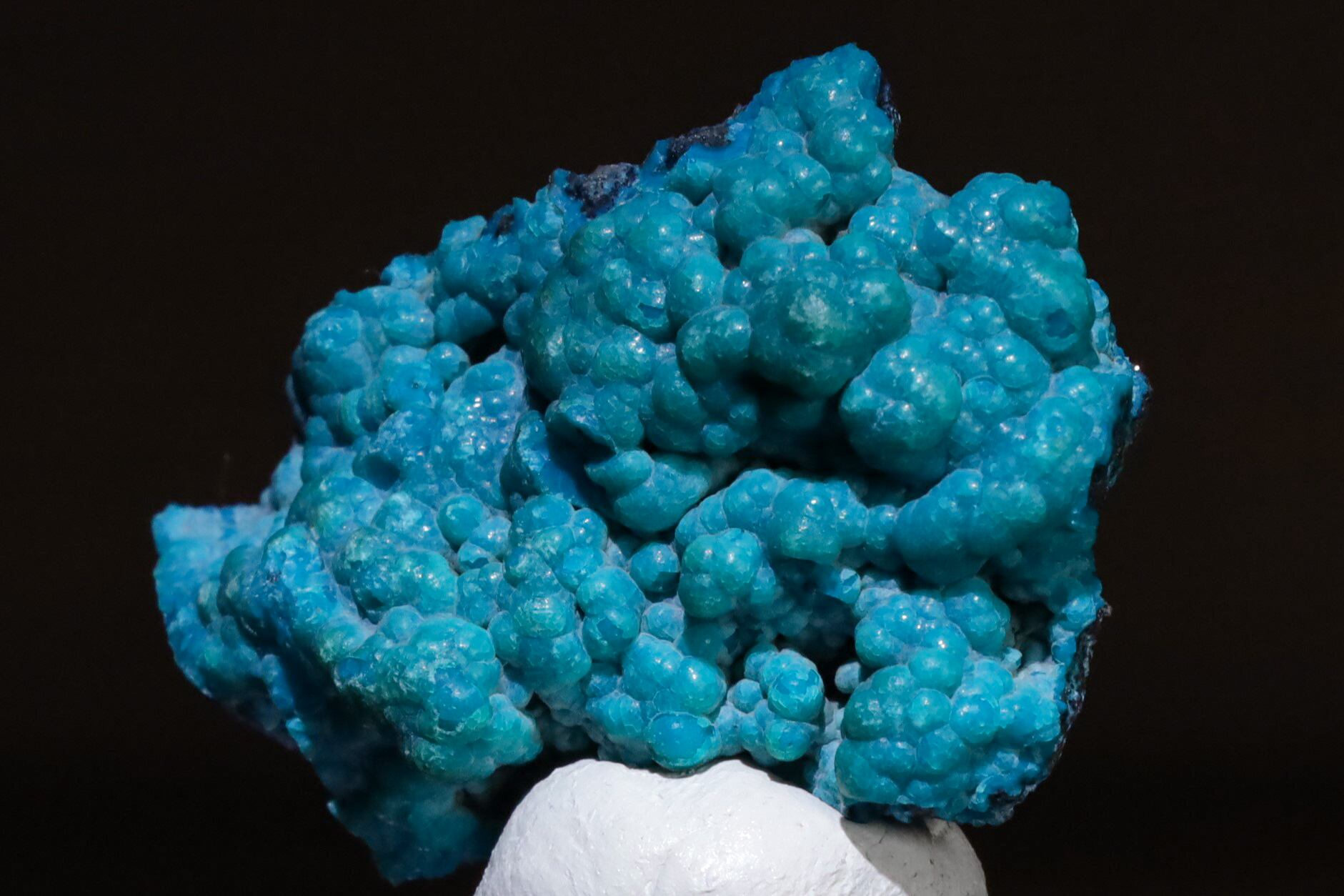 こちらはそのカッパーベルトに位置する鉱山から産出した、鮮やかな色味を見せる歴史的な銅の名産地のカタンガ地域特有の地質的環境に由来する、銅の二次鉱物でボトリオイダルな結晶造形もいい感じのクリソコラ結晶です。