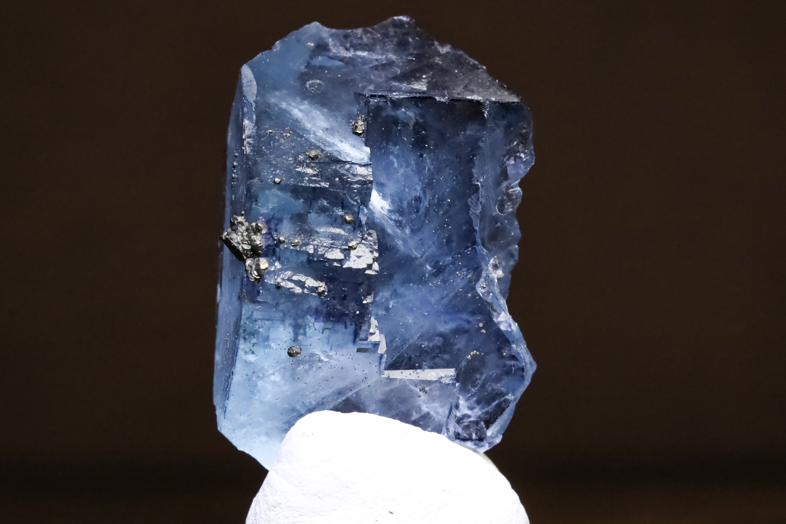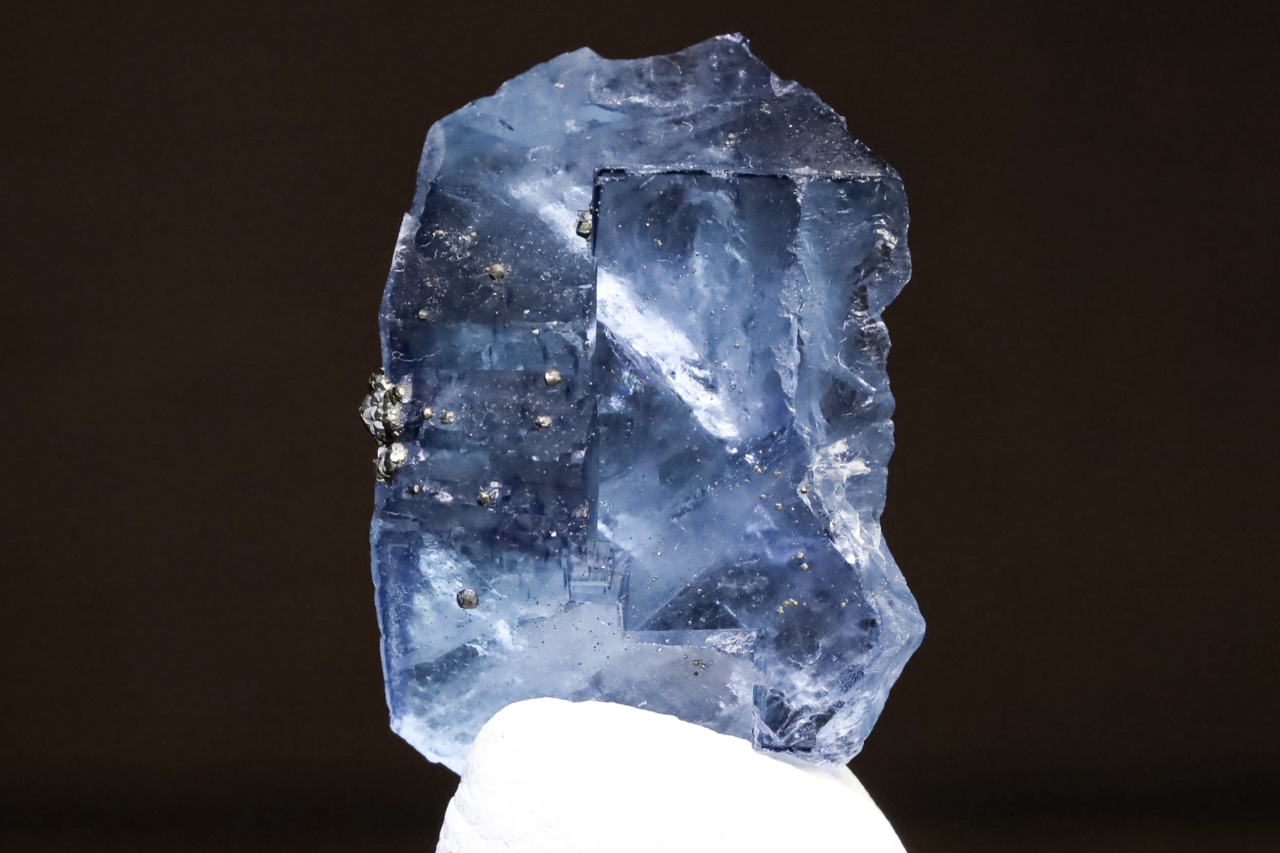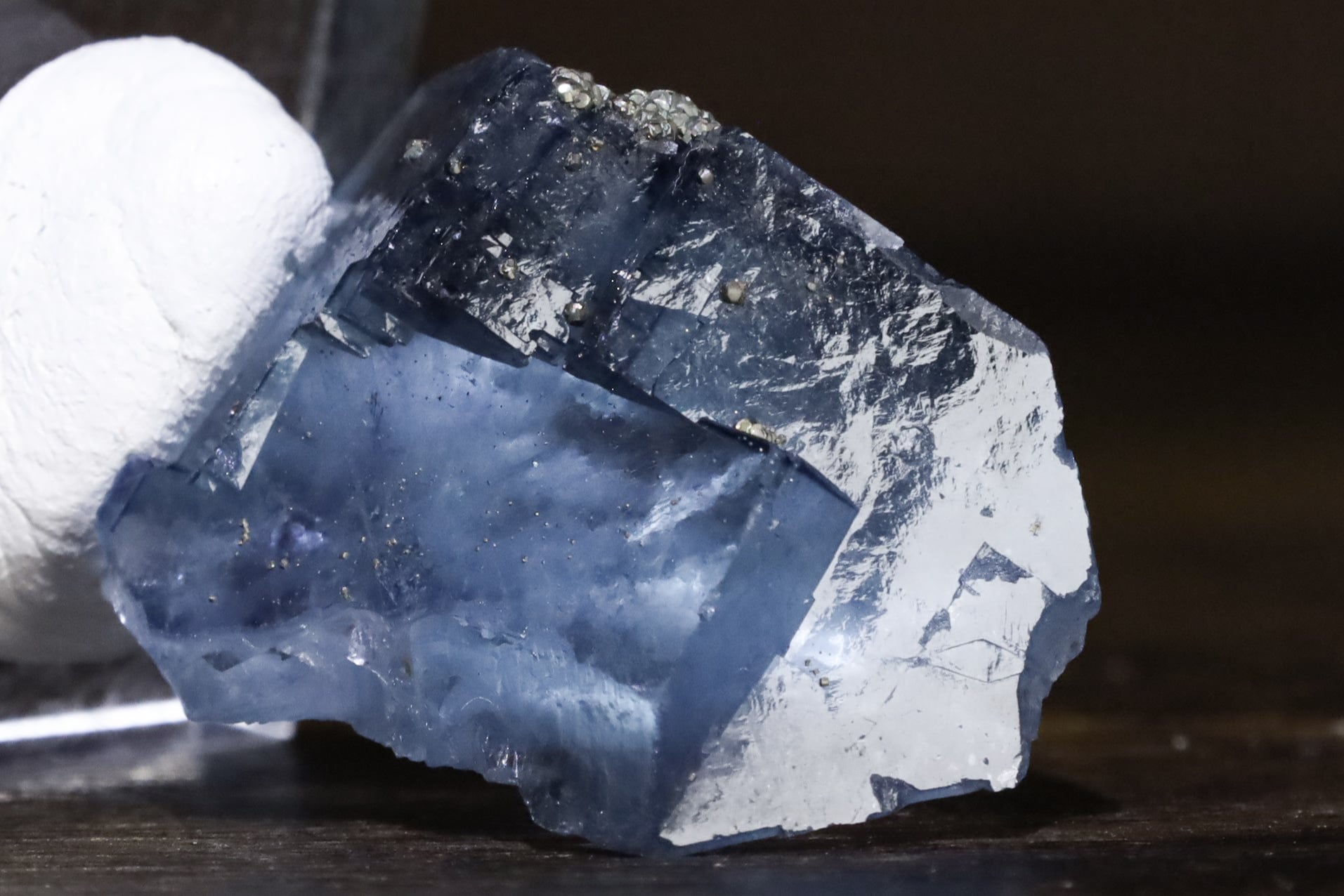 パイライトがONした、パープル感じる部分がある、通常の緑色や紫色に比べて希少で美しいブルー色味を持ったヤオガンシャン産の蛍石です。