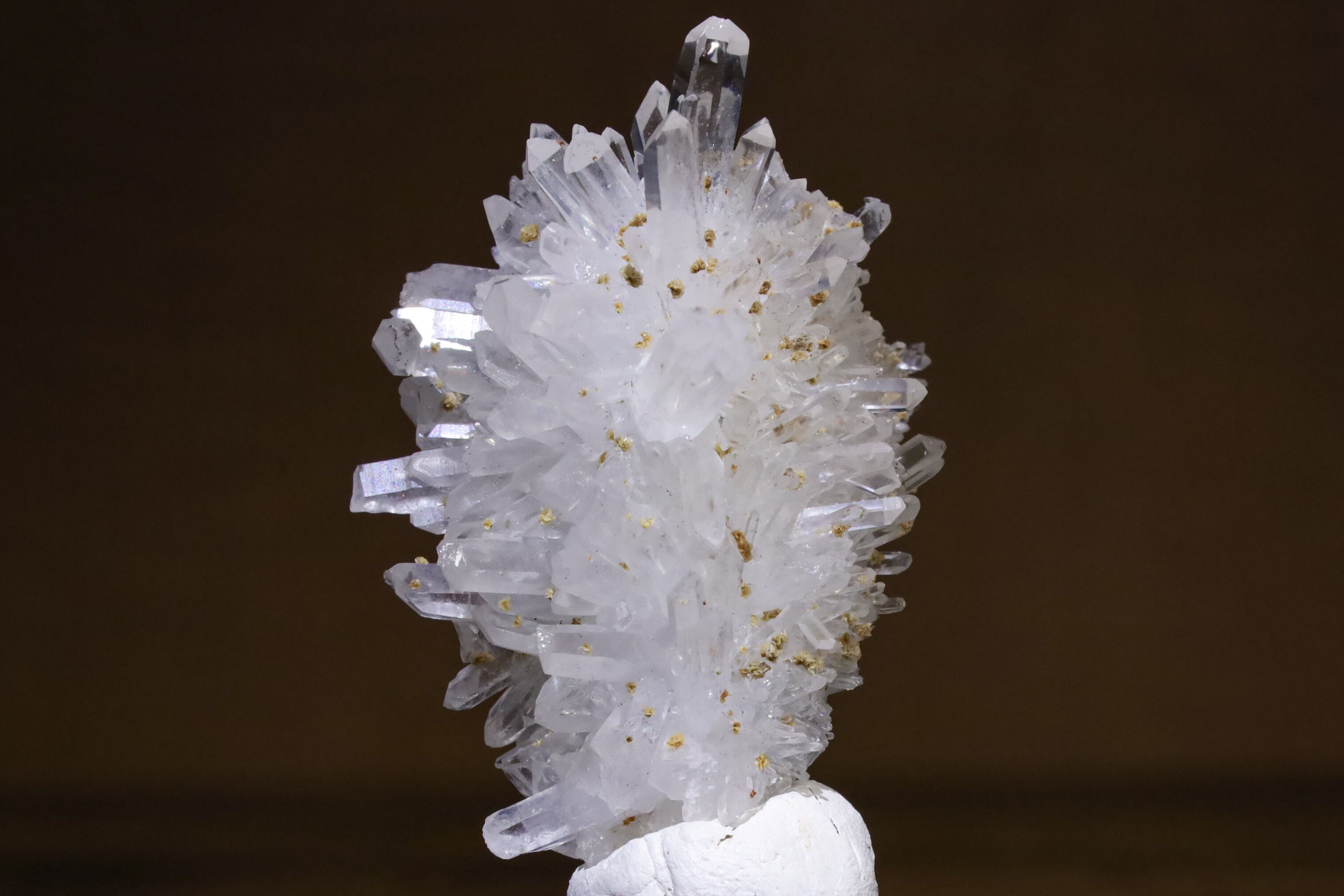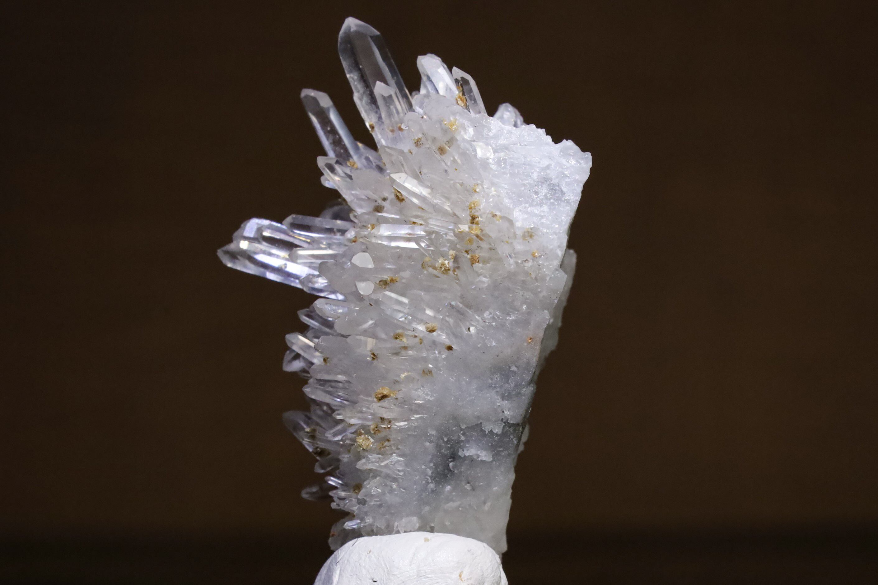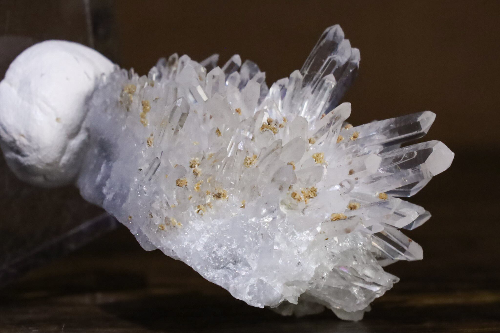 この標本は、鉄を含む鉱液が石英脈に浸透し、冷却・結晶化する過程でシデライトが形成されたものと思われ、欠け、オレ等ある柱もありますが、全体的には綺麗な結晶で、茶褐色の結晶が透明感あるクォーツと調和し、自然が生み出した美を堪能できます。