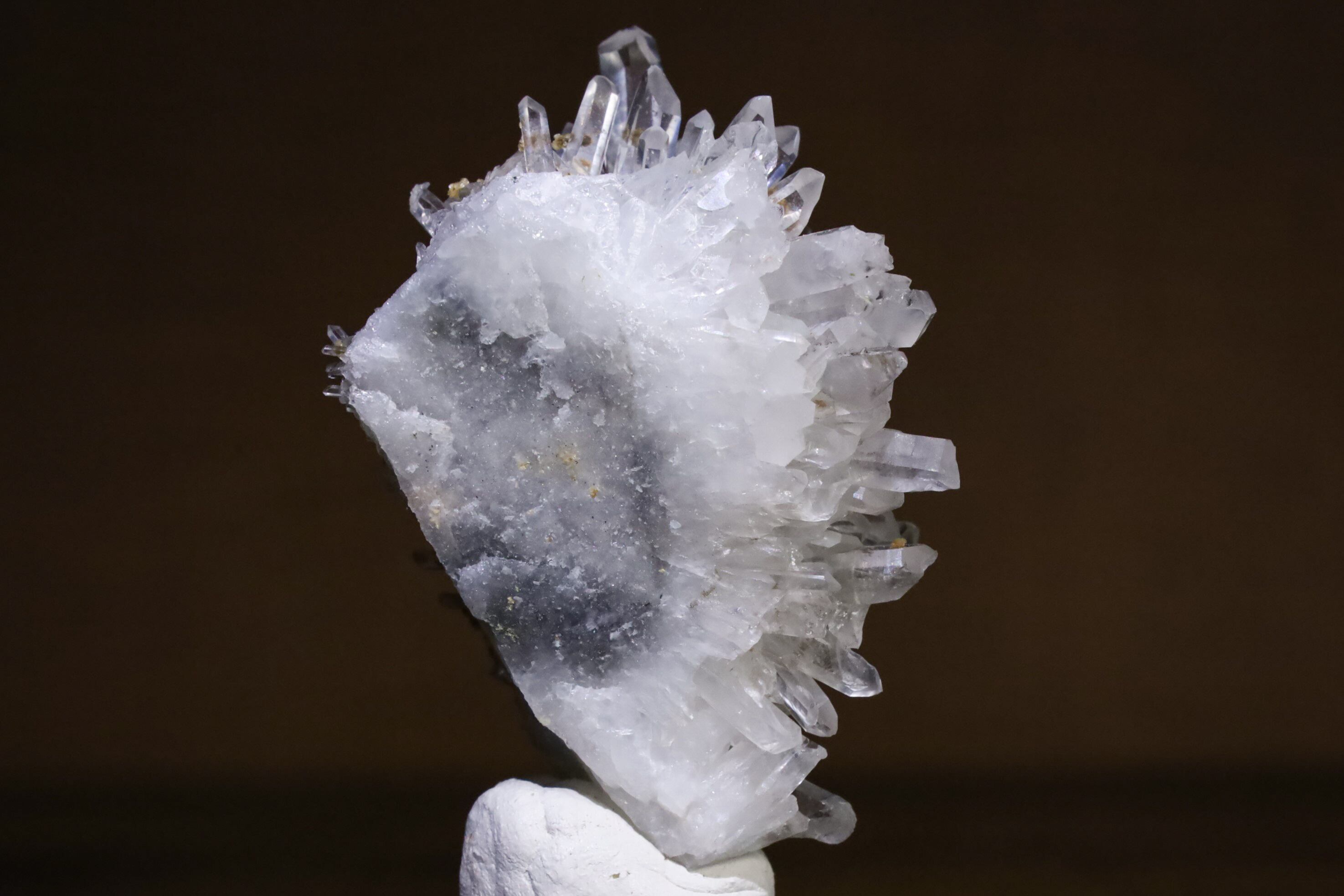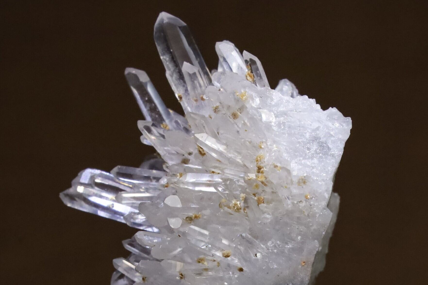 こちらはブルガリア、ロドピ山脈のマダンに位置する Septemvri Mine産の、クォーツの結晶上にシデライト(菱鉄鉱)が共生した標本です。ロドピ山脈は古生代の変成岩と石灰岩を基盤とし、数千万年前の地殻変動と熱水活動によって形成された鉱物資源の宝庫で、マダンはその中心的な産地として世界的に知られています。