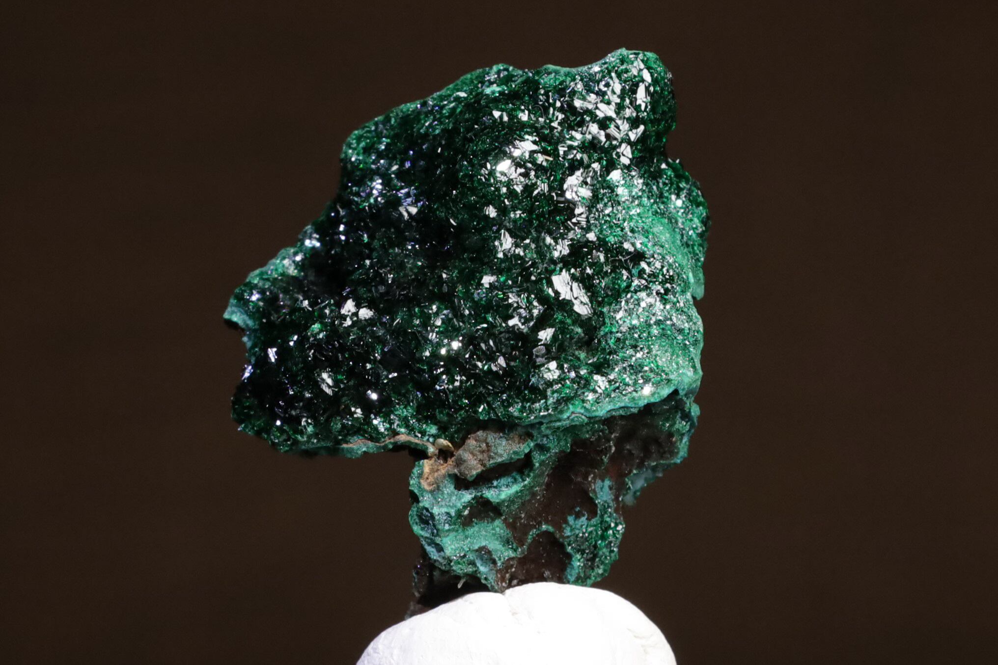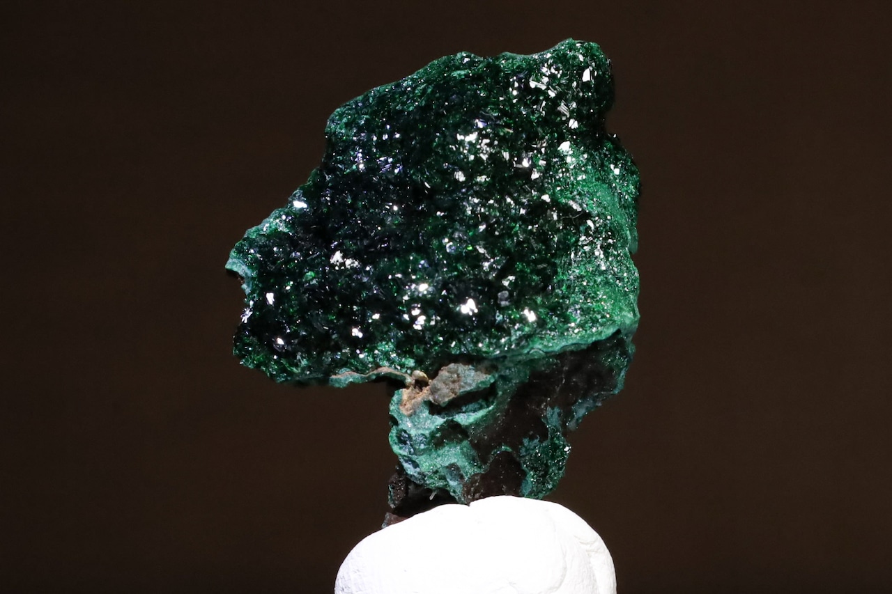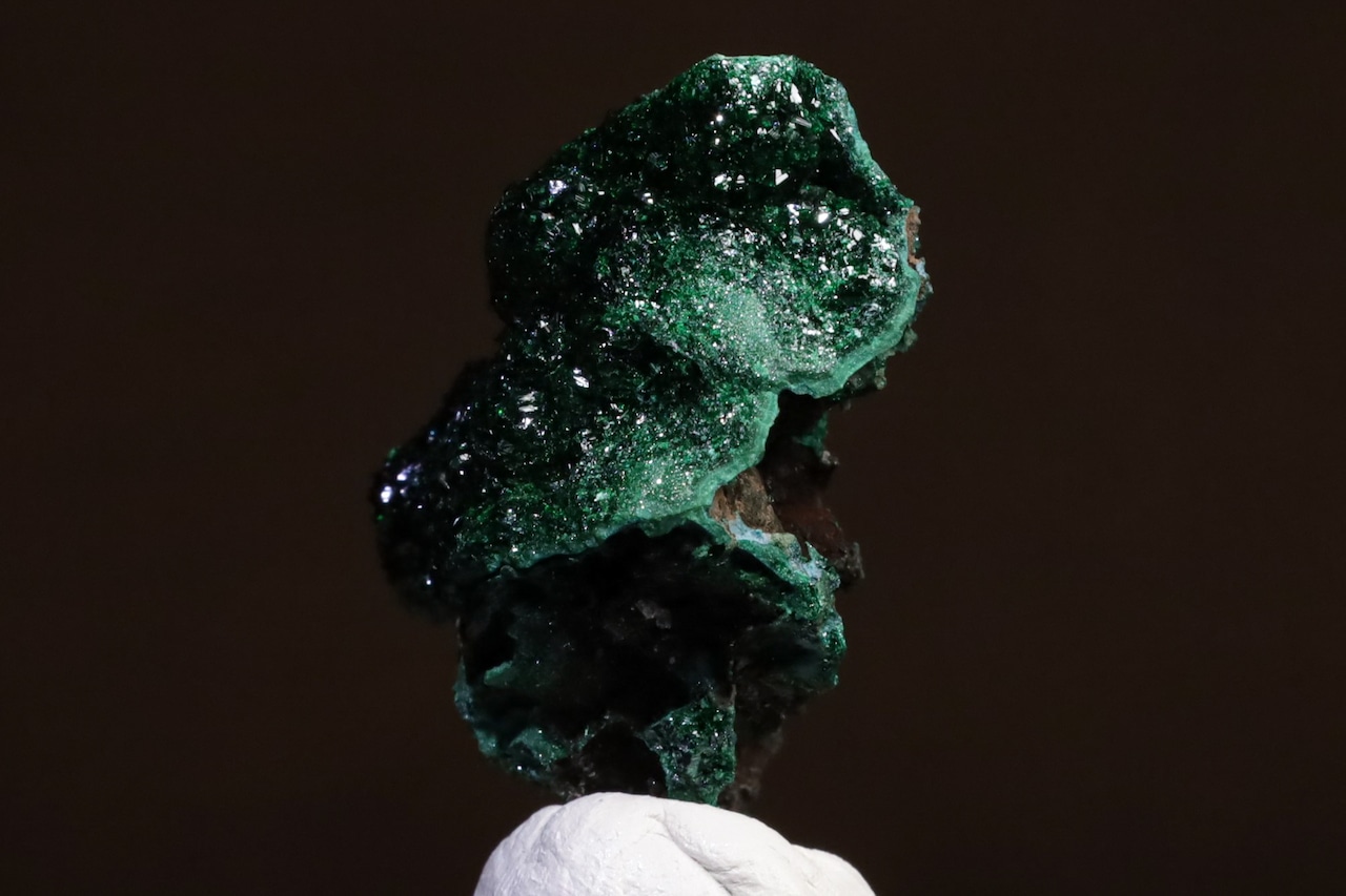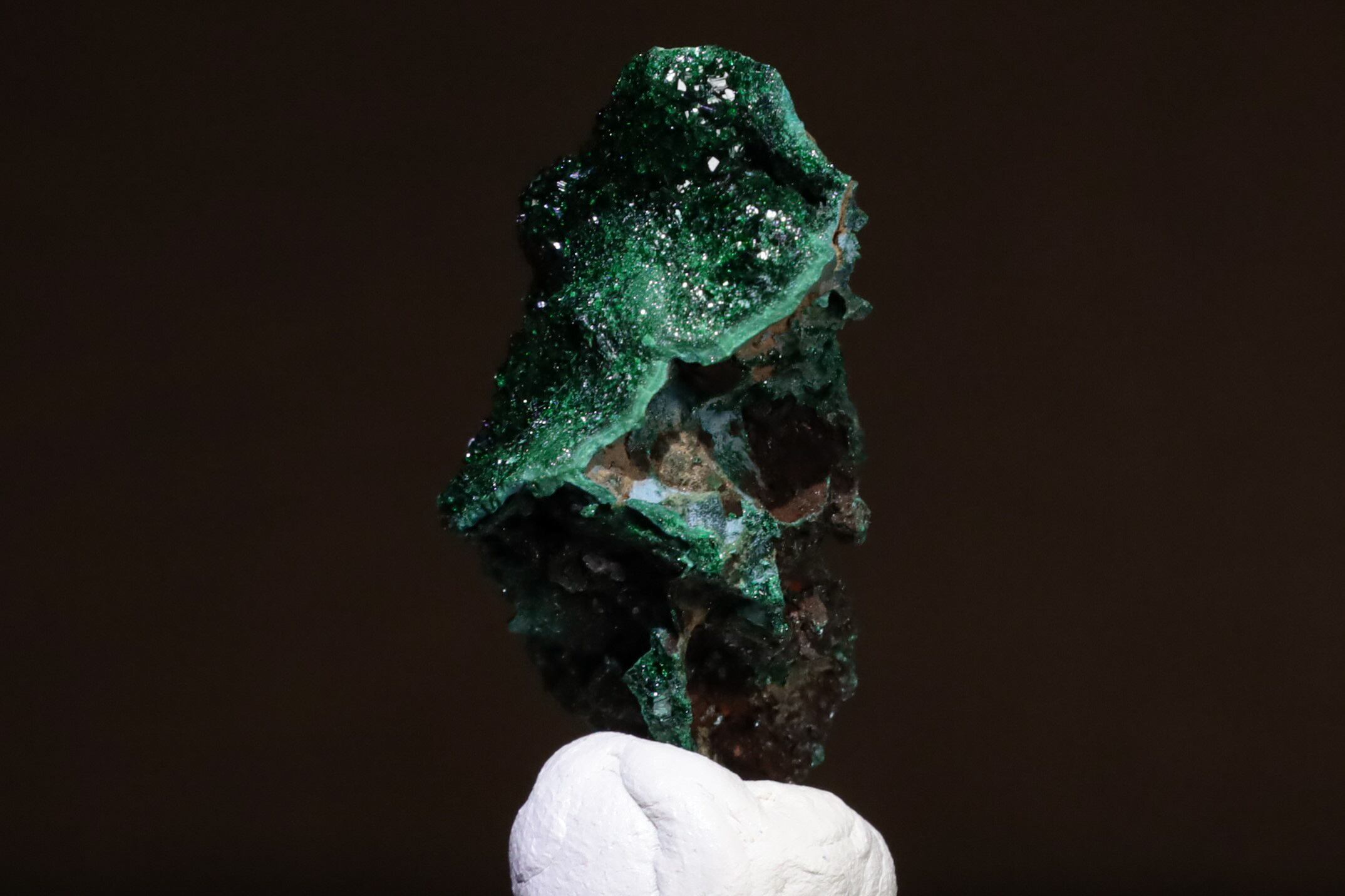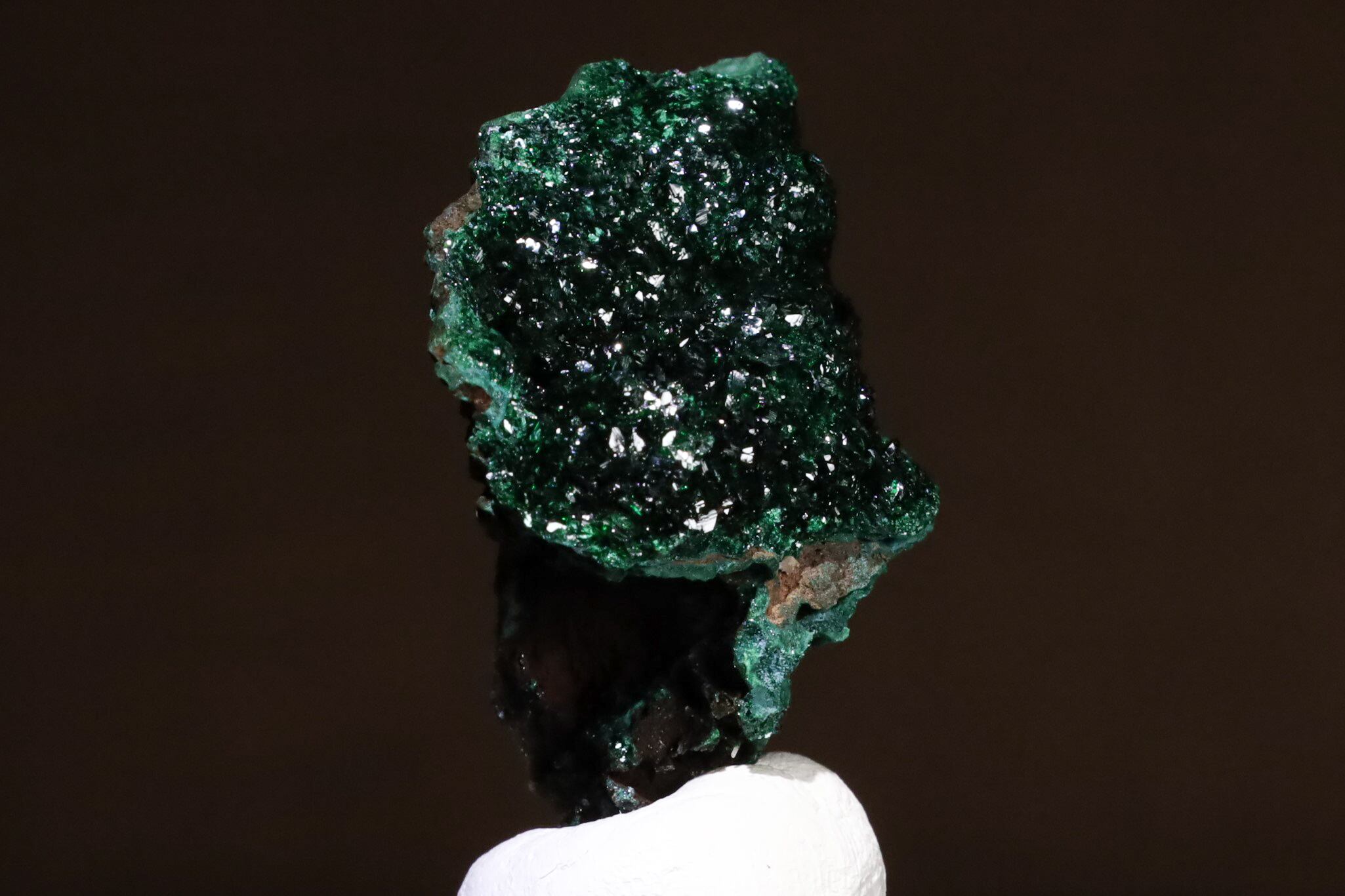 こちらはその鉱山から産出した、鮮やかな緑色を見せるリベセナイトの結晶がマラカイトの上に華やかに成長した標本で、通常光下では5枚目の画像のような感じで、また燐銅鉱も肉眼でも小さくわかりますが、光源直下でルーペを使用しますとメイン画像のような、いや実際には当方の機材スペックでは再現が難しい、とても美しい色味や燐銅鉱の名にふさわしい造形のリベセナイトの結晶の世界をお楽しみいただけます。