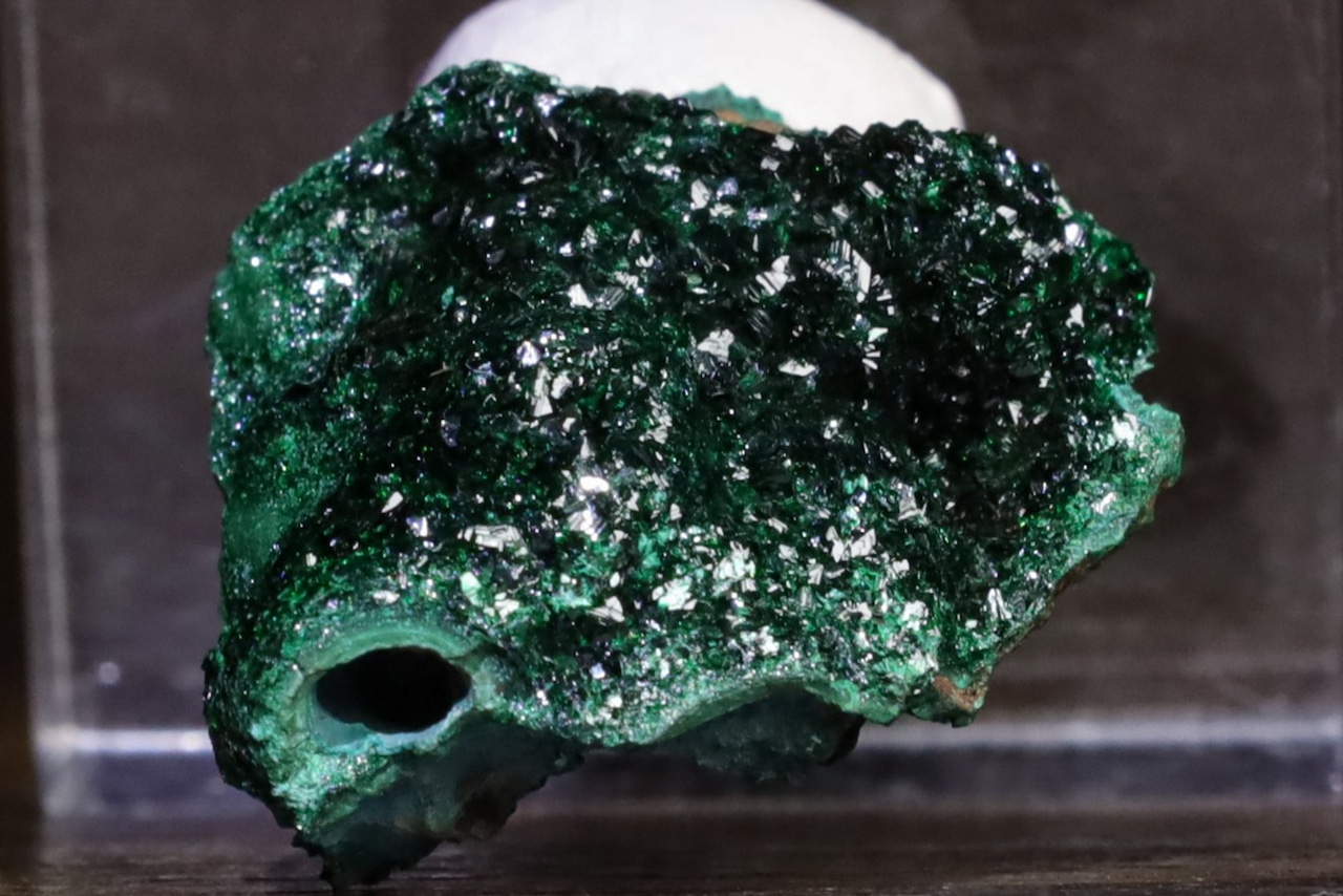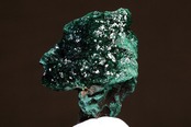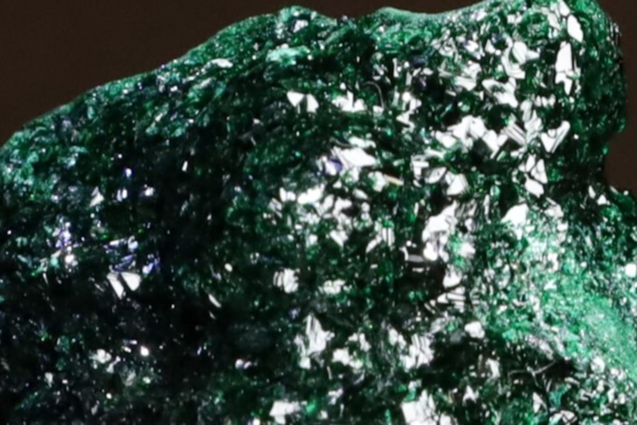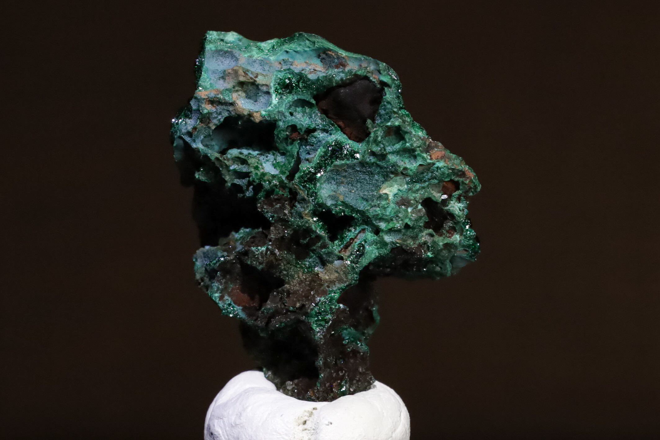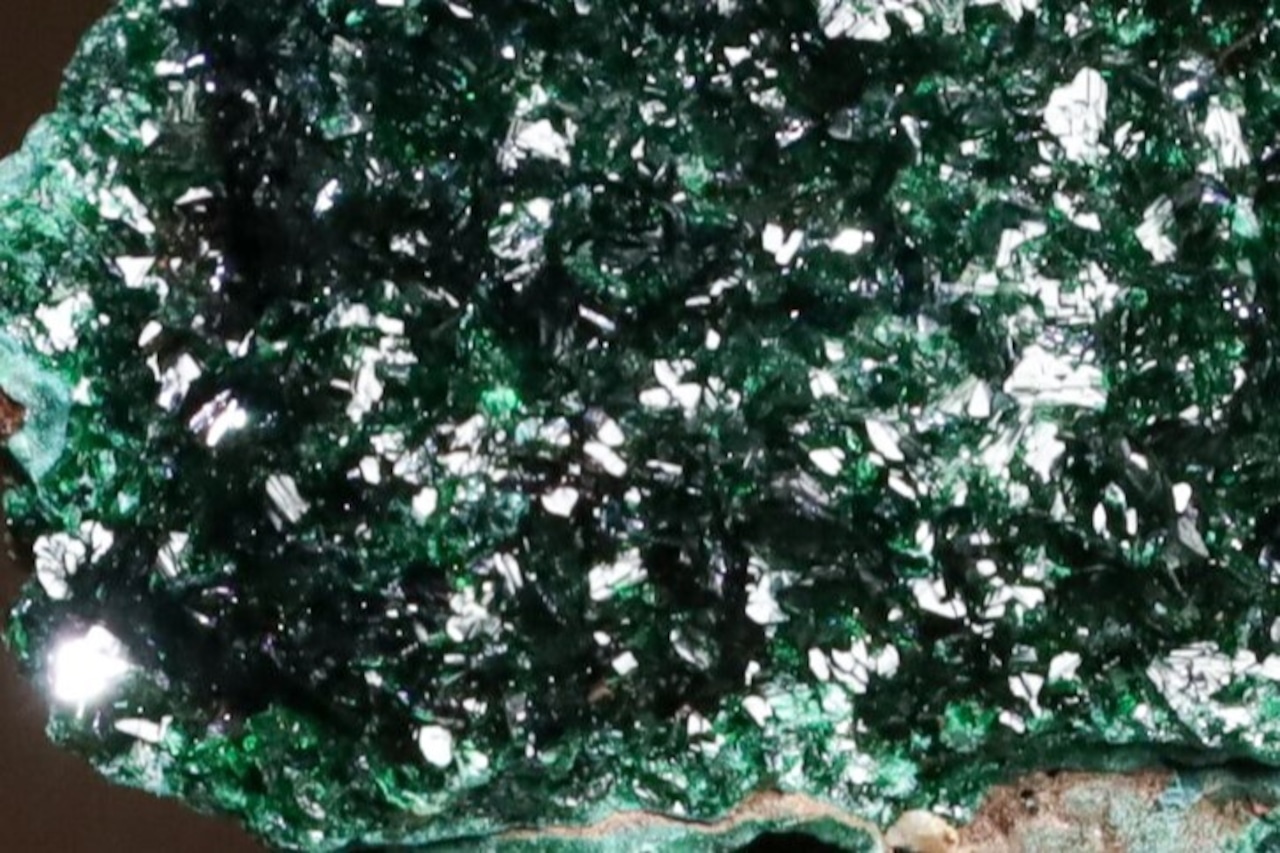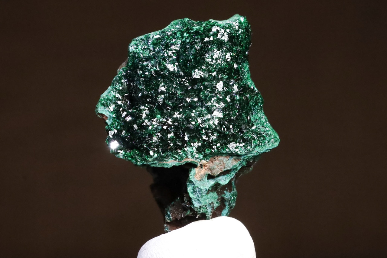 こちらはその鉱山から産出した、鮮やかな緑色を見せるリベセナイトの結晶がマラカイトの上に華やかに成長した標本で、通常光下では5枚目の画像のような感じで、また燐銅鉱も肉眼でも小さくわかりますが、光源直下でルーペを使用しますとメイン画像のような、いや実際には当方の機材スペックでは再現が難しい、とても美しい色味や燐銅鉱の名にふさわしい造形のリベセナイトの結晶の世界をお楽しみいただけます。