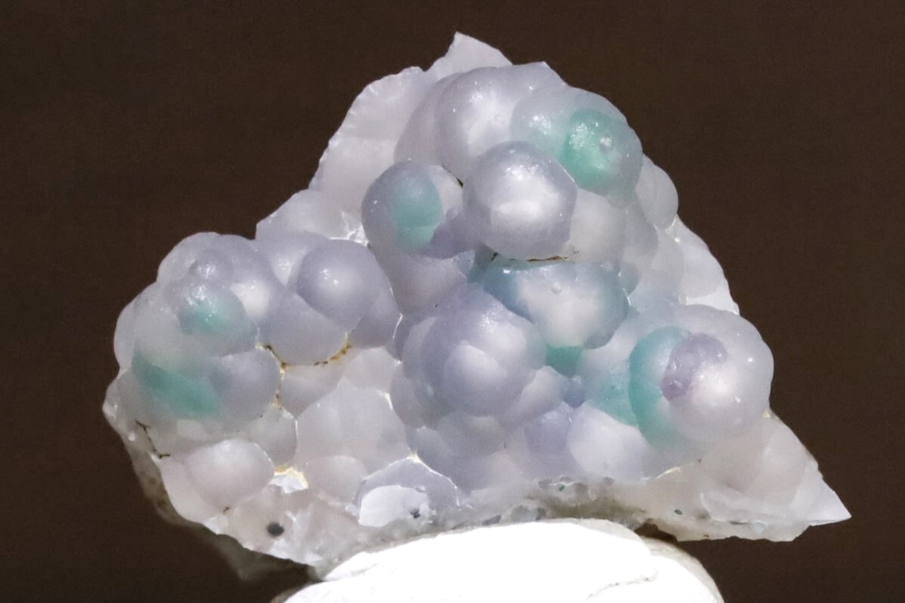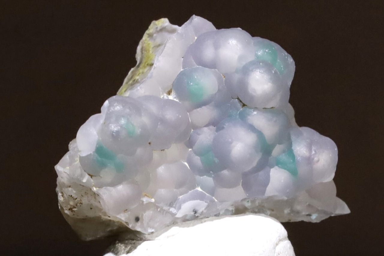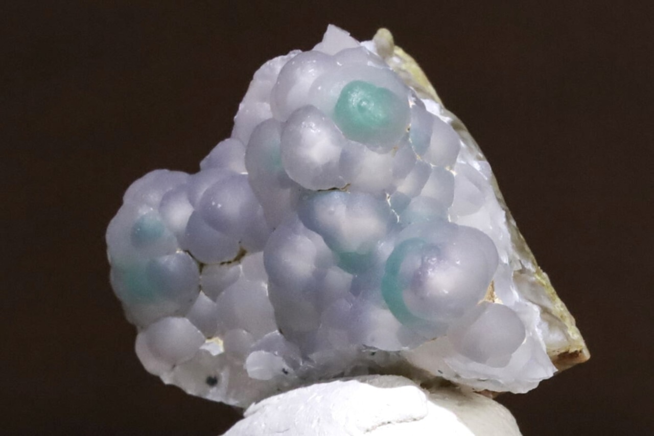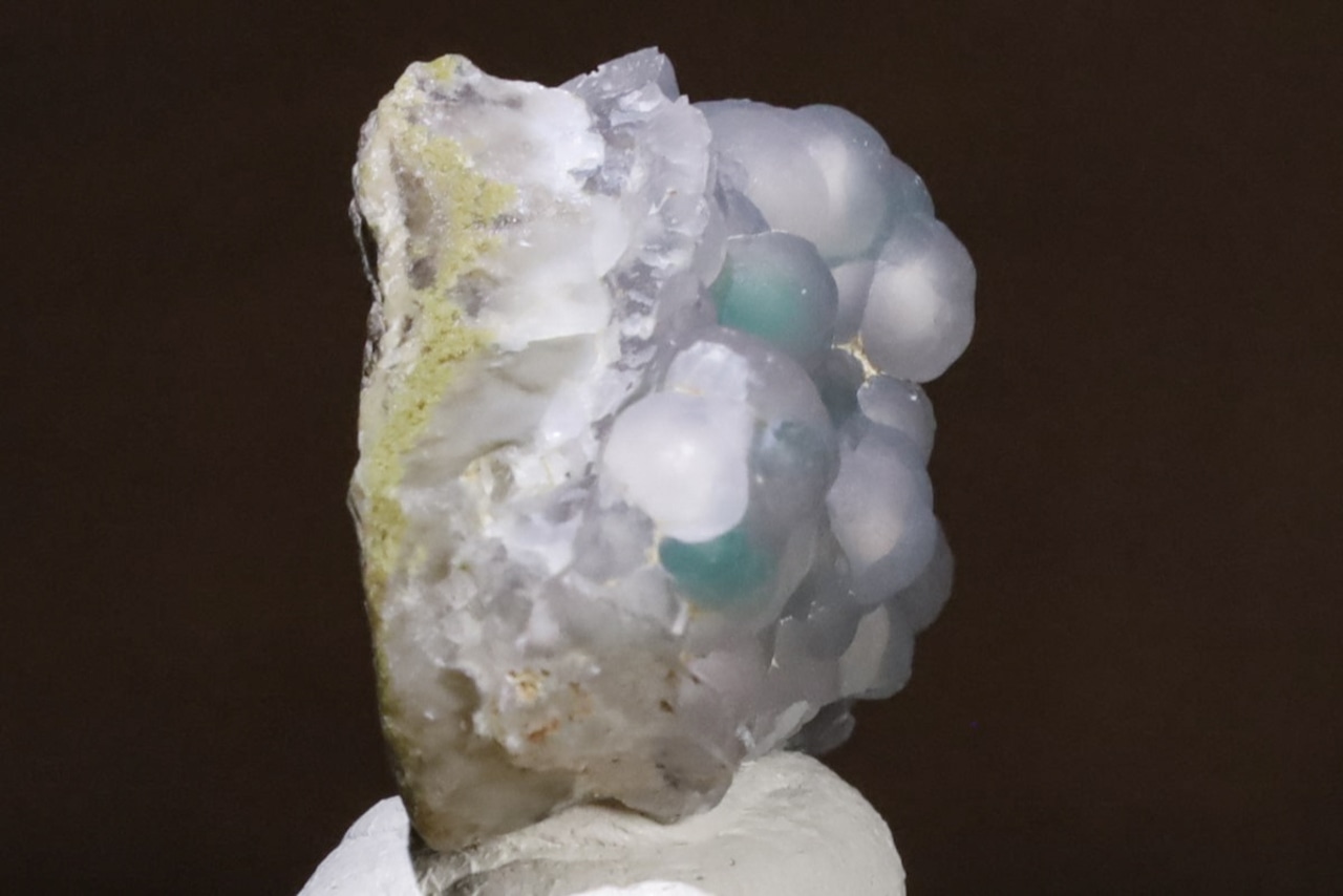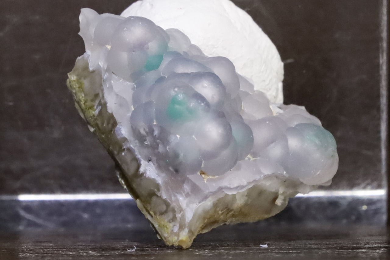 こちらは インドネシアObi Island産の、2022年発見とされている「クリソコラ・イン・カルセドニー」の美しい標本で、通常光下では6枚目のように見える時もありますが、光源近くではメイン画像のような感じに見え、少し透明感ある中、僅かにガウスがかったメタリック感を感じさせる光沢の中、綺麗な色味の特異なインクルージョン美が見られます。
