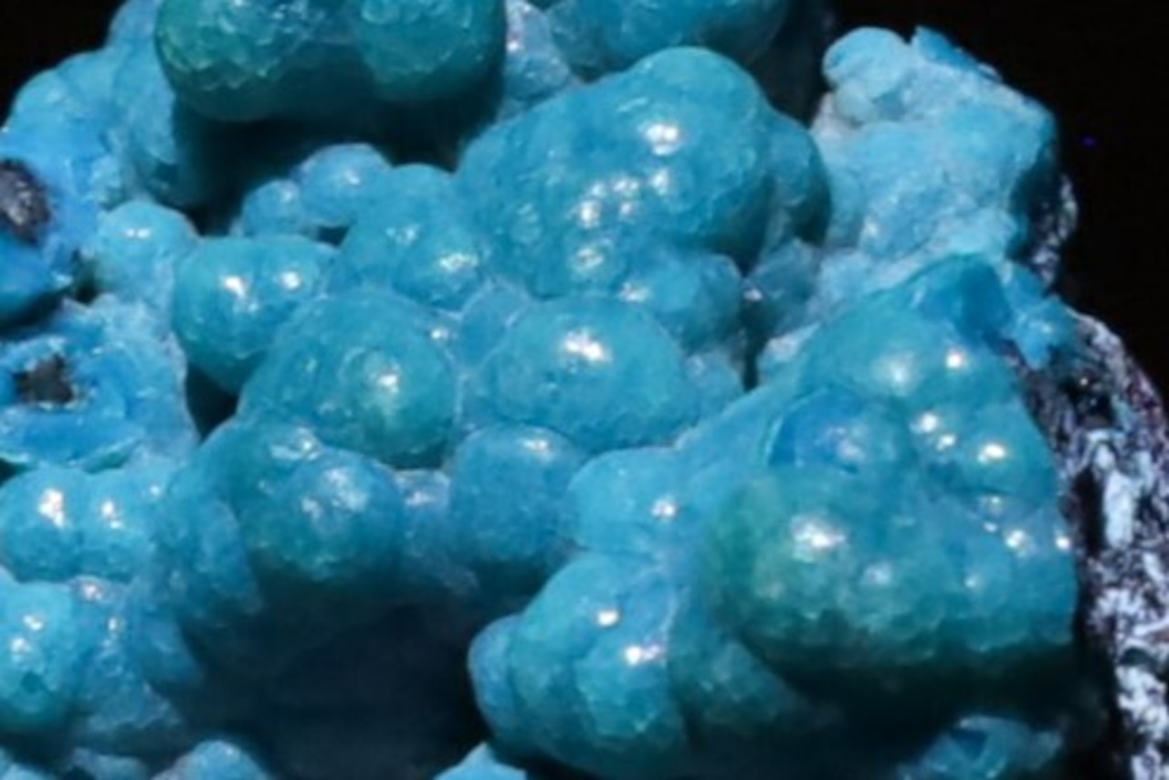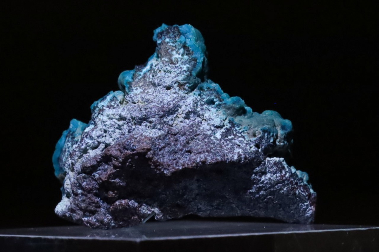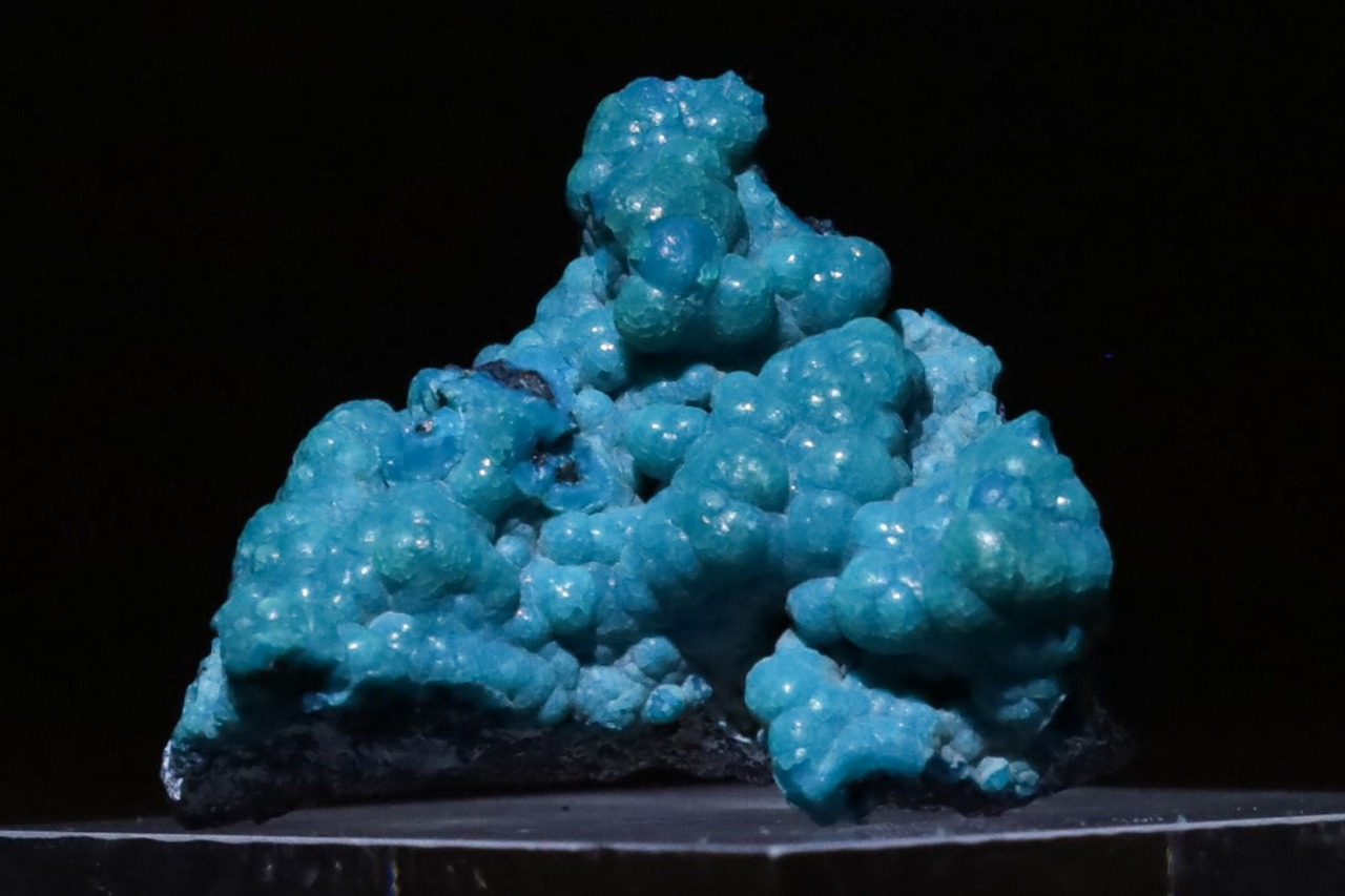 こちらはそのカッパーベルトに位置する鉱山から産出した、鮮やかな色味を見せる歴史的な銅の名産地のカタンガ地域特有の地質的環境に由来する、銅の二次鉱物でボトリオイダルな結晶造形もいい感じのクリソコラ結晶です。