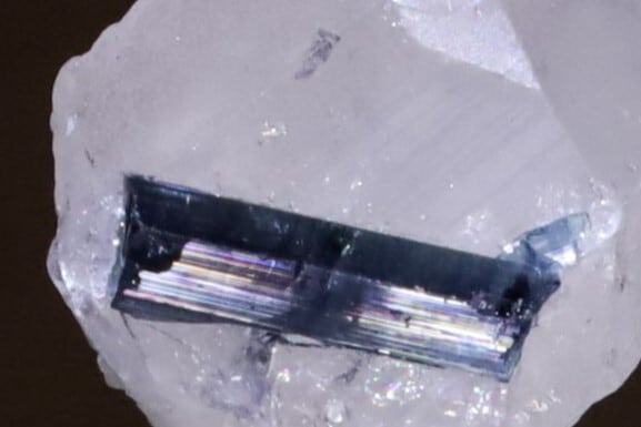 通常光下では光源との角度によっては3&8枚目の画像のようにも見えますが、手持ちライトをあてると角度によってはメイン画像のような(拡大した画像程大きくは見えませんが)、美しいイリディセントフラッシュが見られる、稀有な美しさを持ったインディゴライトトルマリンとクォーツの共生結晶です。