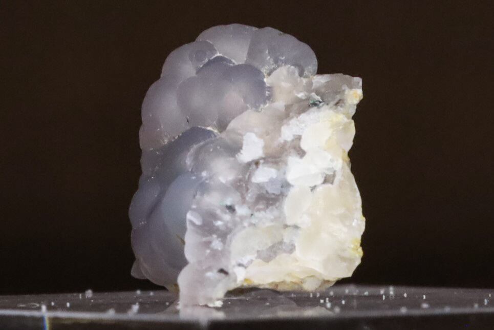 この標本の希少性は、カルセドニー中に自然に クリソコラなど銅鉱物を含む共生構造 を持つ例が極めて限られていることにあります。オビ島の地底で、時間と化学反応が織りなした微細な鉱物の共演を感じさせる一品を、ぜひあなたのコレクションに迎えてみてはいかがでしょうか。