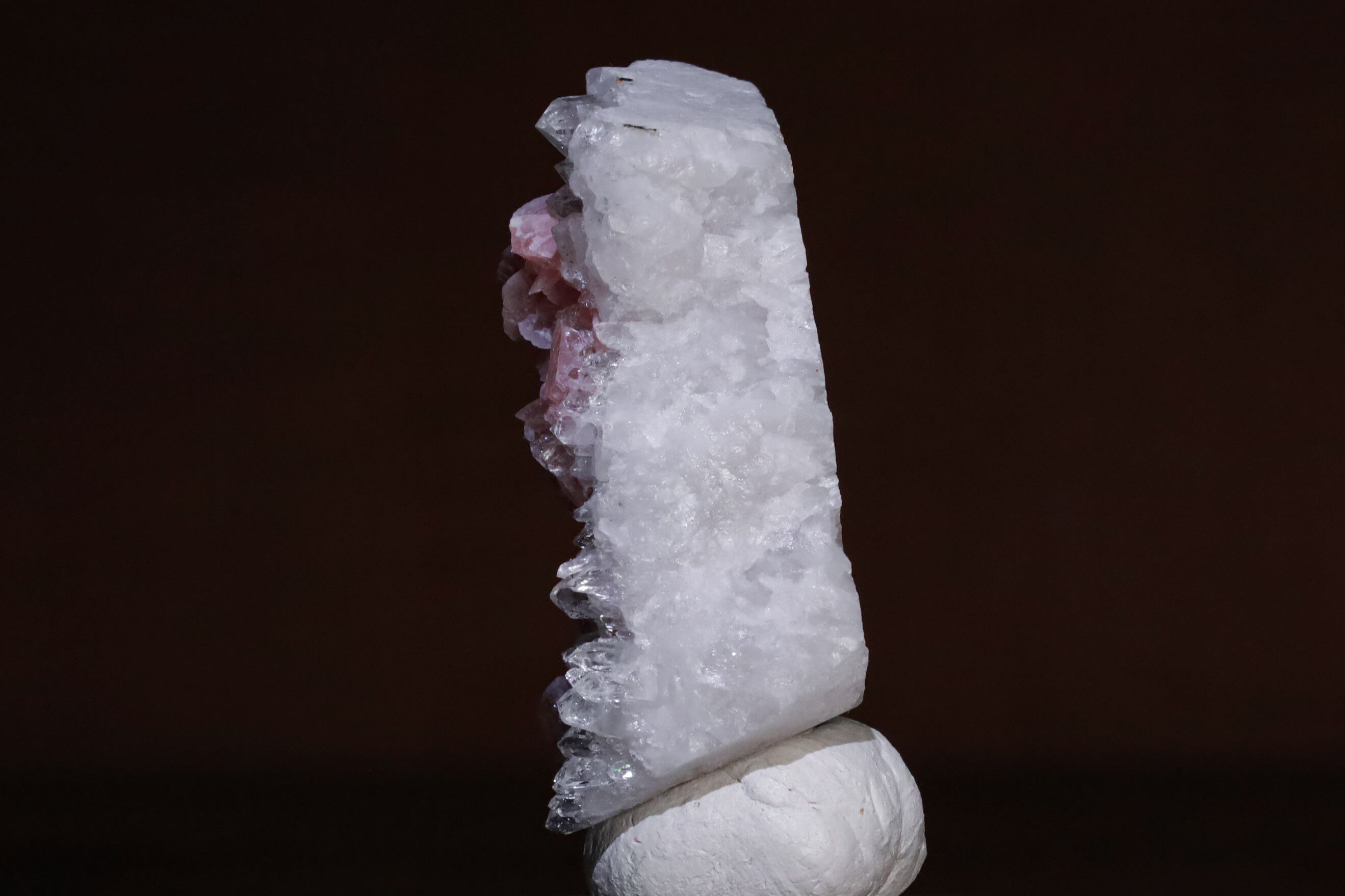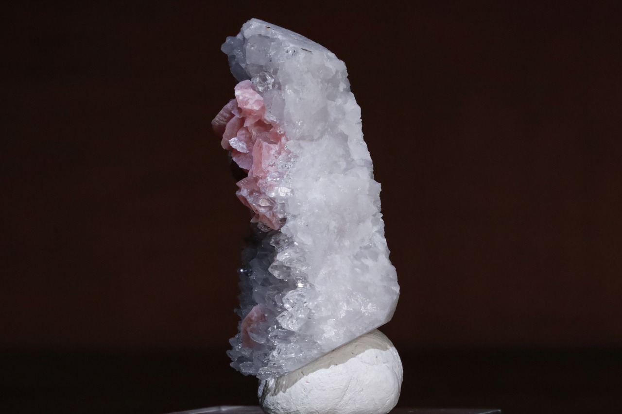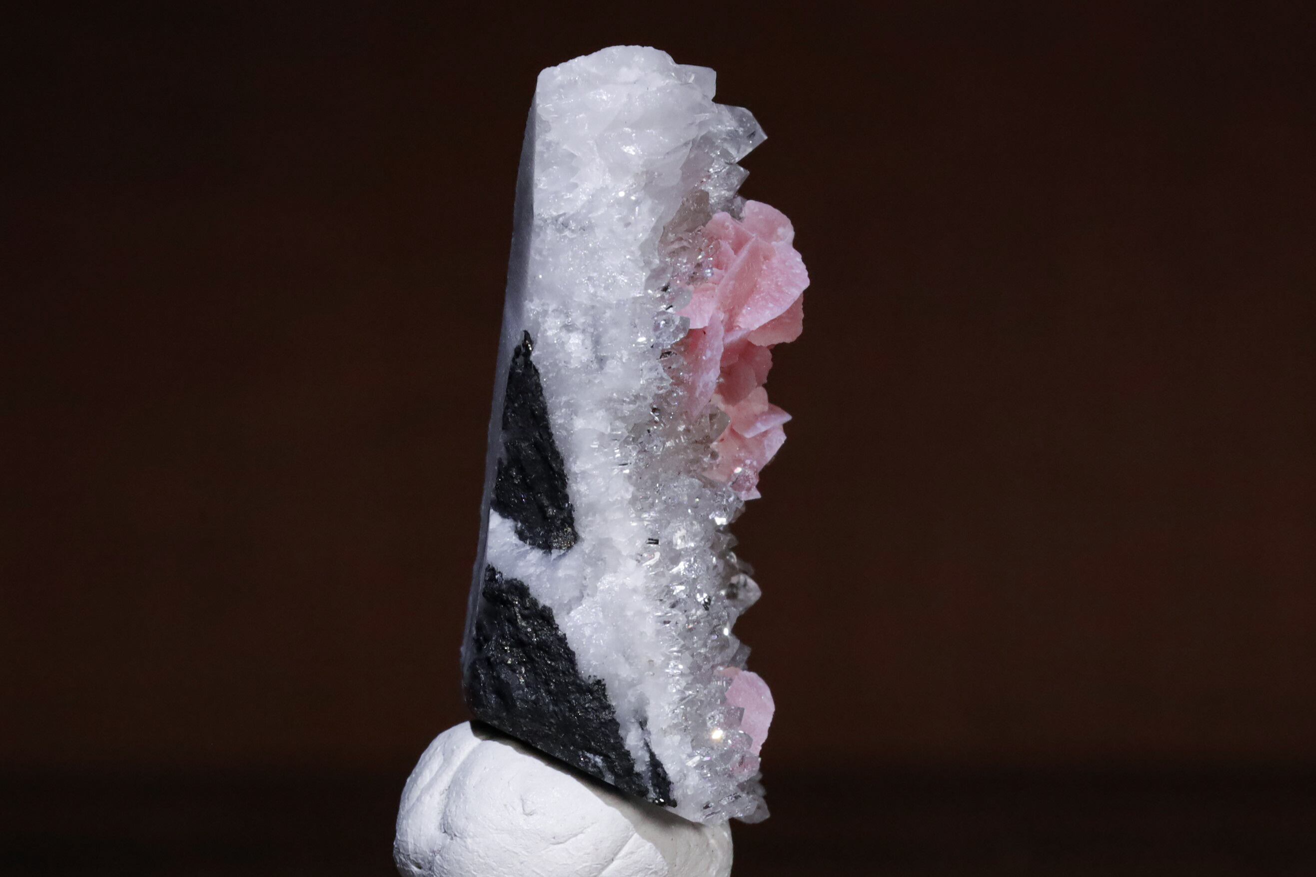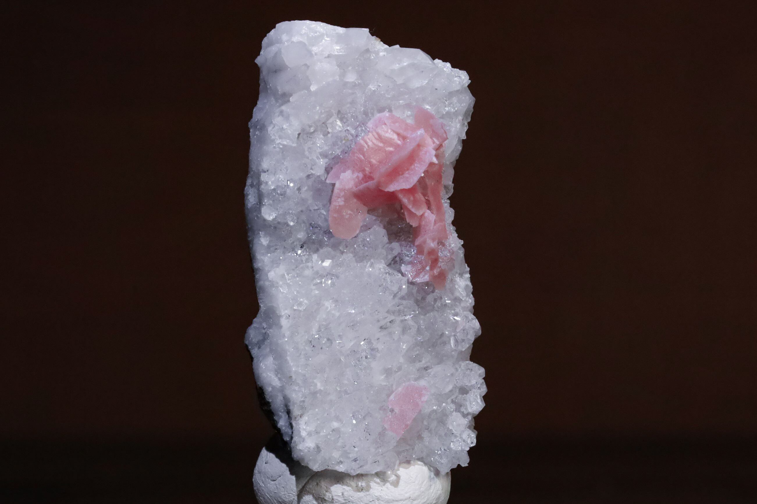 ちらは、中国の広西チワン族自治区、柳州市のWudong Mineで見つかった、肉眼でも見応えある綺麗なピンクの花弁状のロードクロサイトがクォーツにオンした共生結晶で、キラキラして綺麗です。