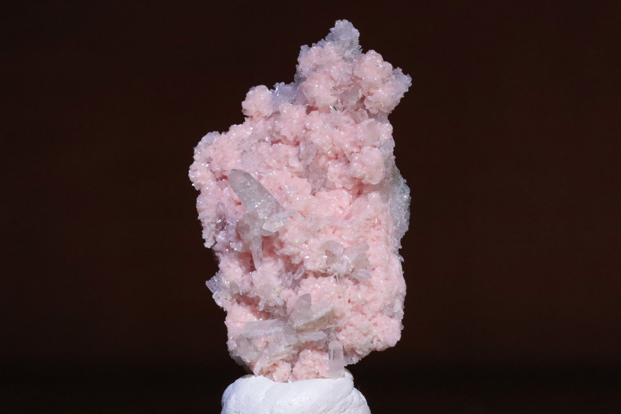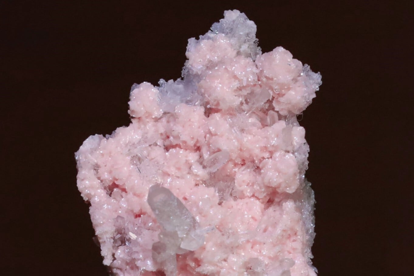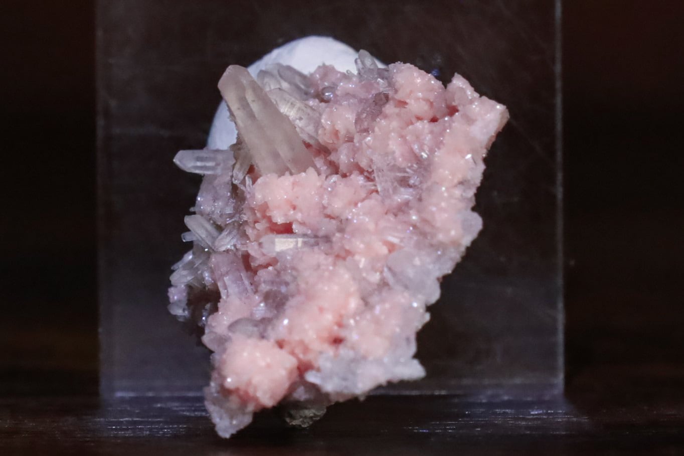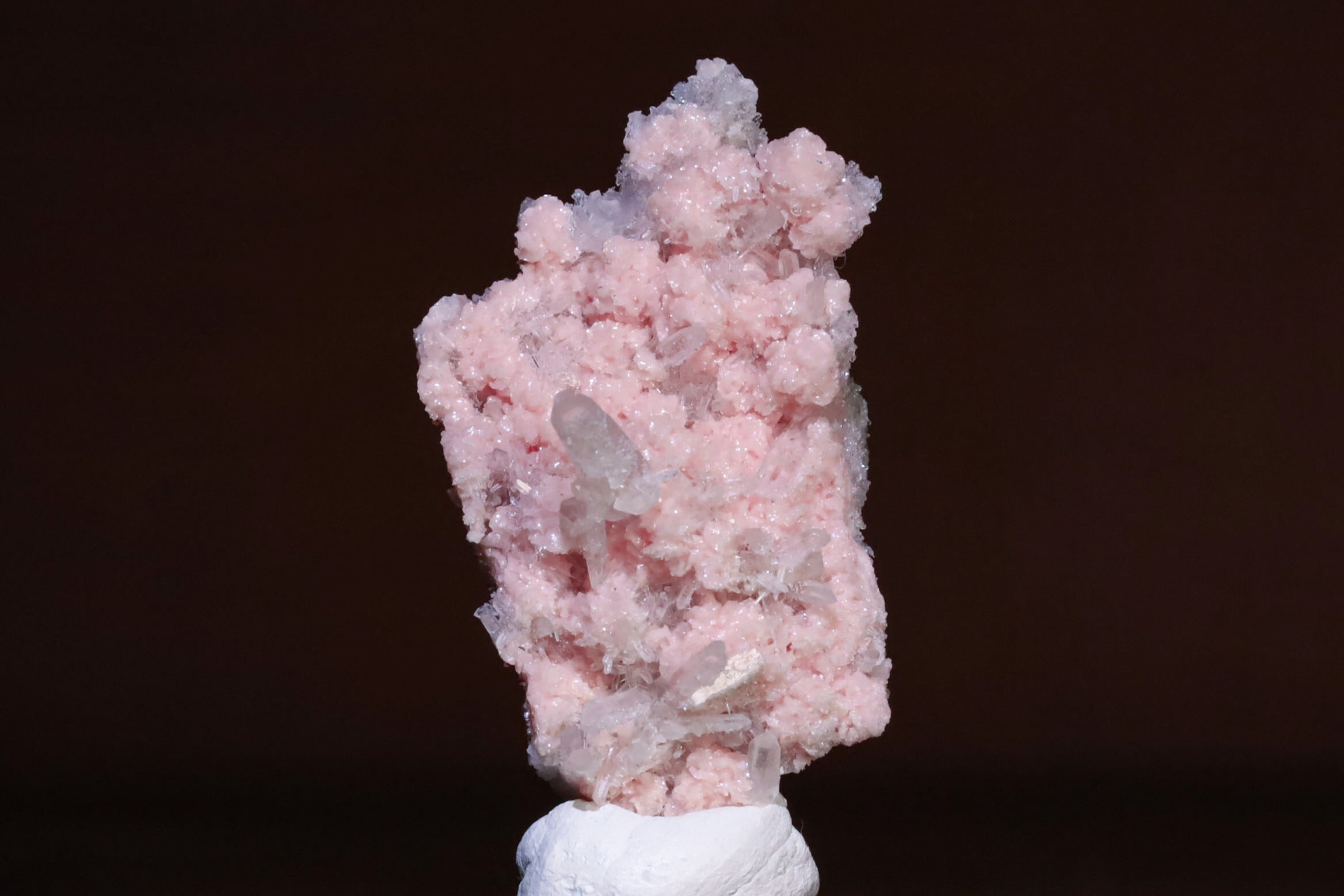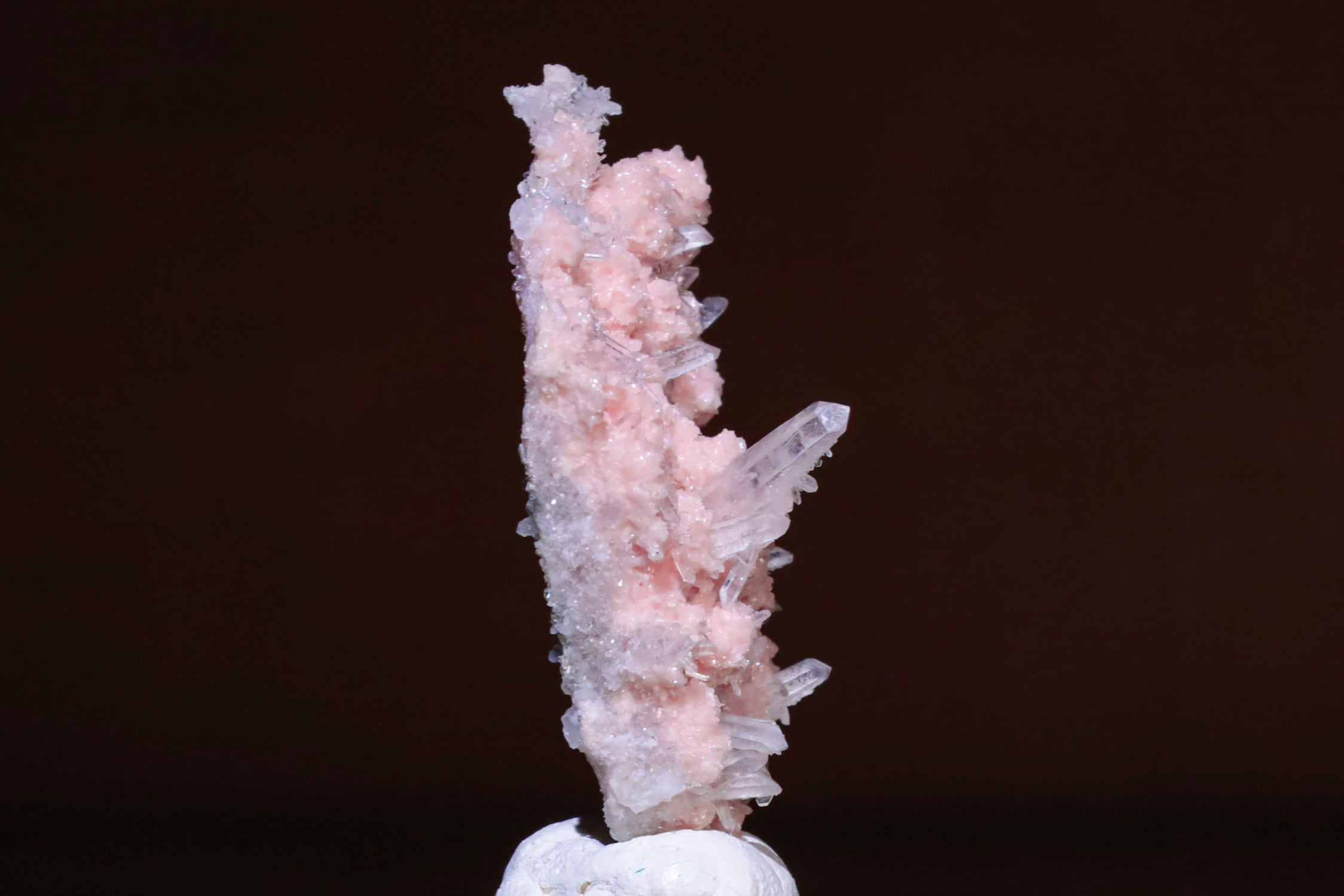 この標本は、地下深部で熱水が石灰岩層や堆積岩に浸透し、マンガンを含む鉱液が長い年月の中で冷却され結晶化したものと思われます。透明感あるクォーツと、幾つもあるパステルベビーピンクの綺麗な色味や造形を持った菱マンガン鉱が織りなす、自然界による最高の芸術的共生結晶の世界が見られます。