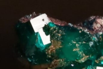 そんなコチラ、通常光下では4枚目の画像のような感じにも見え、マラカイトは肉眼では少し感じる程度ですが、光源近くで10倍ルーペで見ると、メイン画像のような、美しい幾何学造形や、カット8のような、いや実際は当店の機材スペックでは再現が不可能な美しい色味の結晶の世界をお楽しみいただけます。