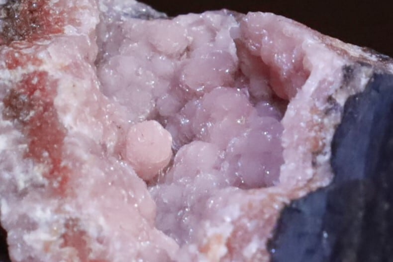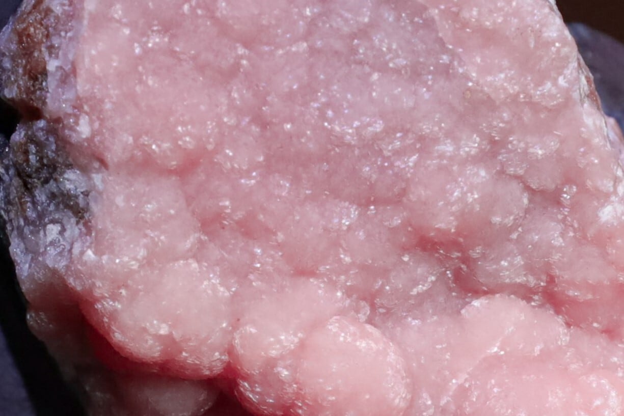N'Chwaning II産のアイスクリームピンクの見事なピンクの色味を持った、ロードクロサイトのモコモコした群晶で、少しVugになっているところなど、ルーペを使用するとかなりキメ細かなロードクロサイトが玉状になっている、美しい群晶の世界が見られます。