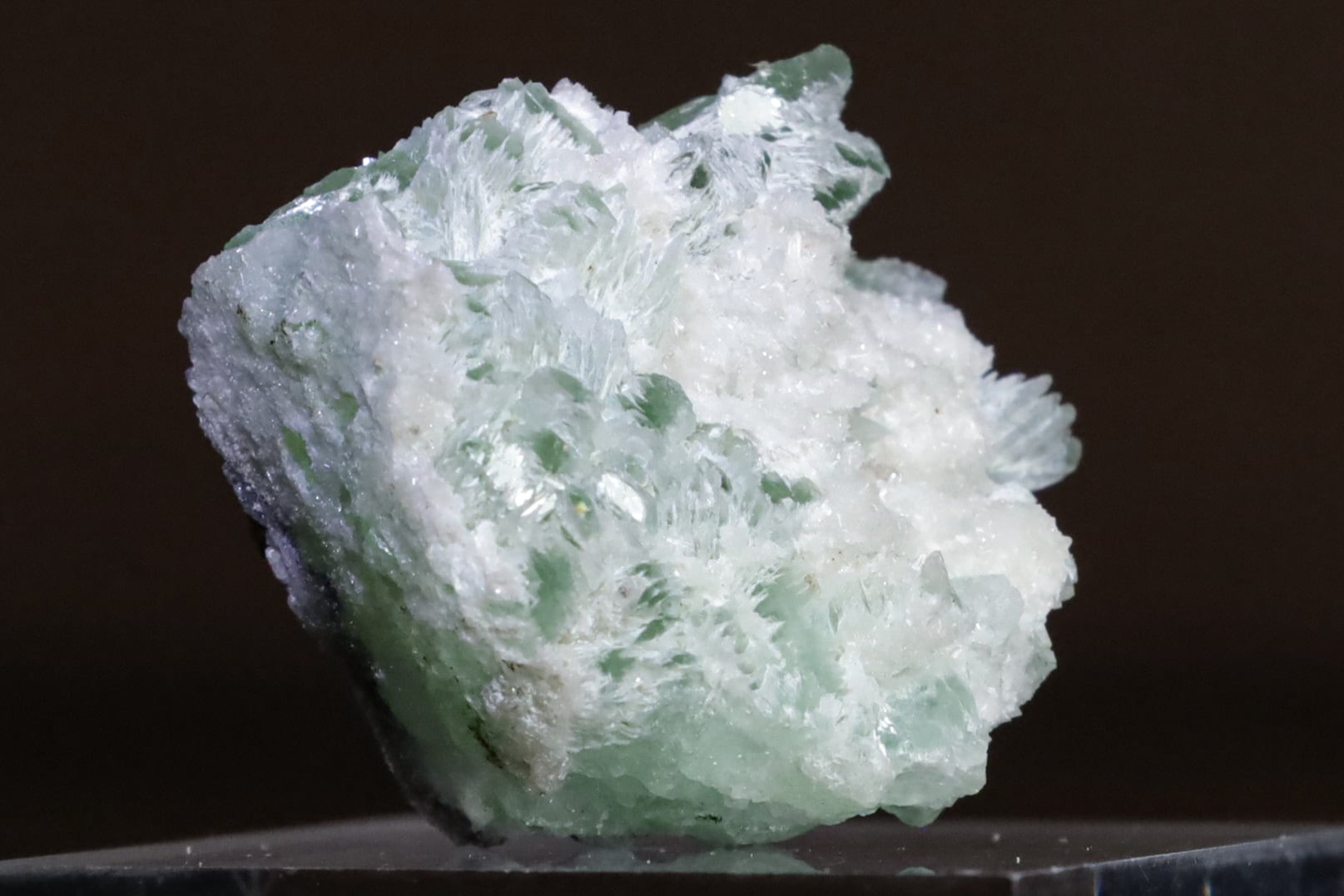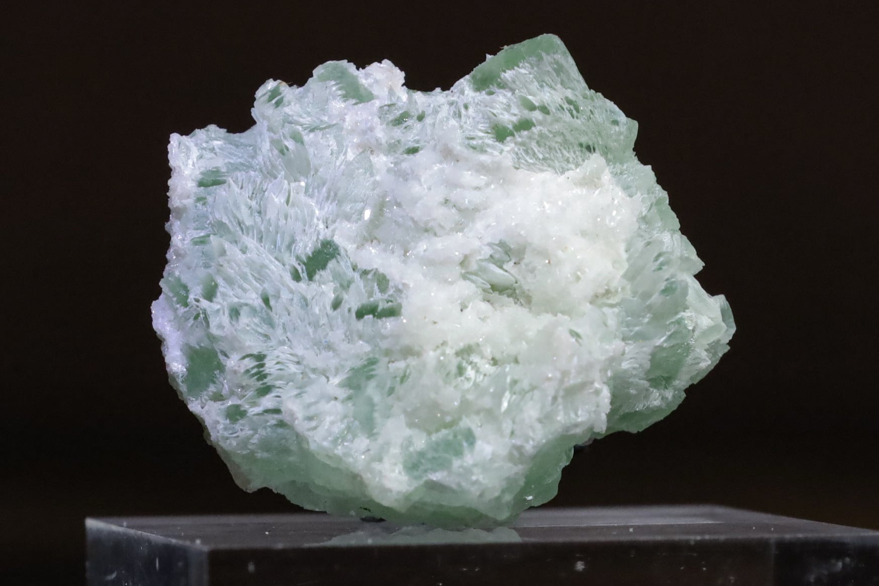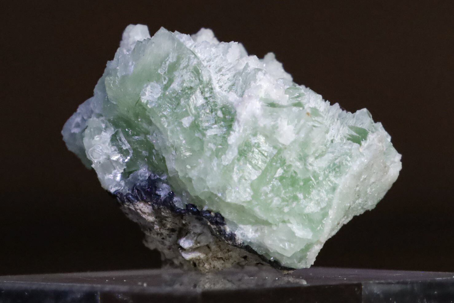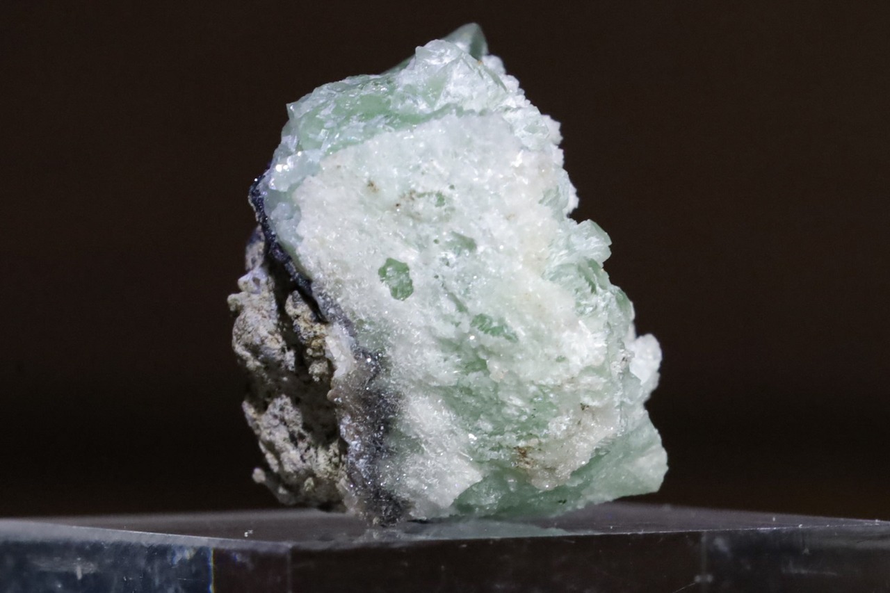 コチラは、この鉱山で最初に発見されたことからSkorpioniteと名付けられたスコルピオナイトが、キャンディーグリーンのような綺麗な色味や光沢を持ったターブッタイトにオンした共生結晶で、肉眼では極々僅かに感じるような感じといった感じではありますが、ルーペを使用するとスコルピオナイトを見ることができます。