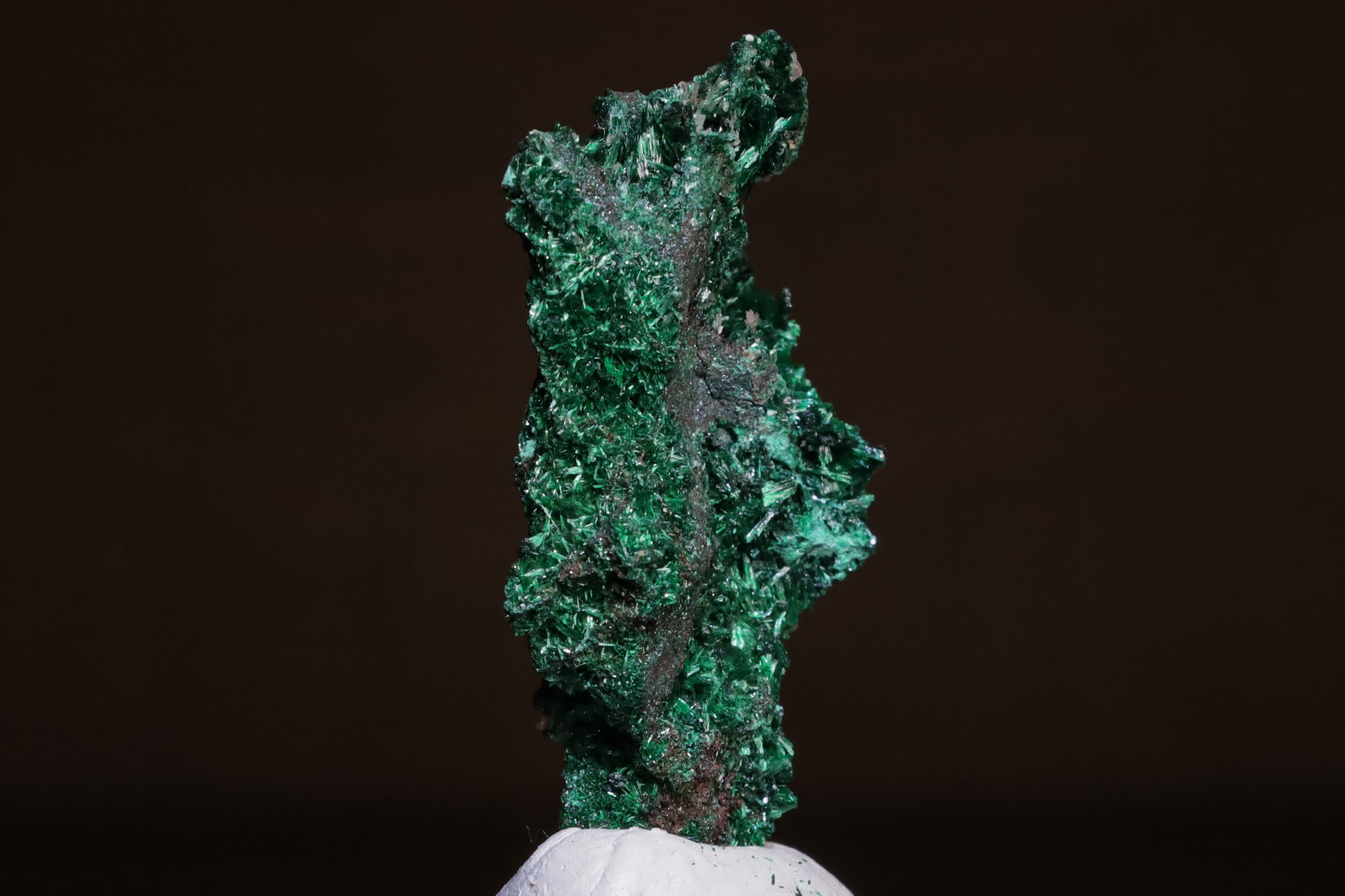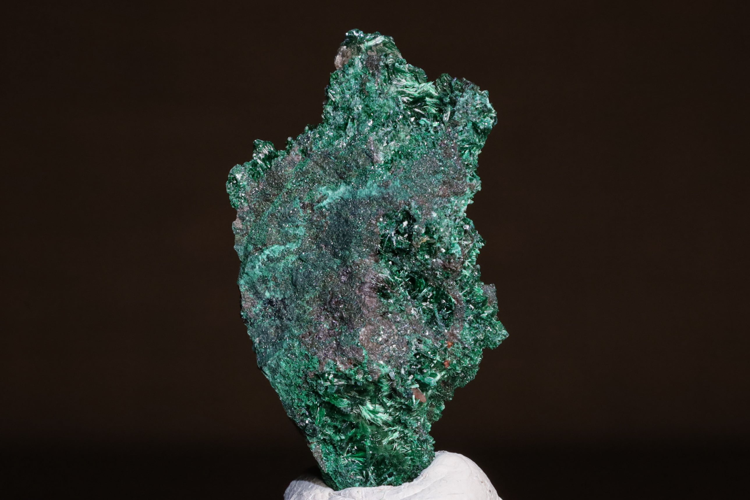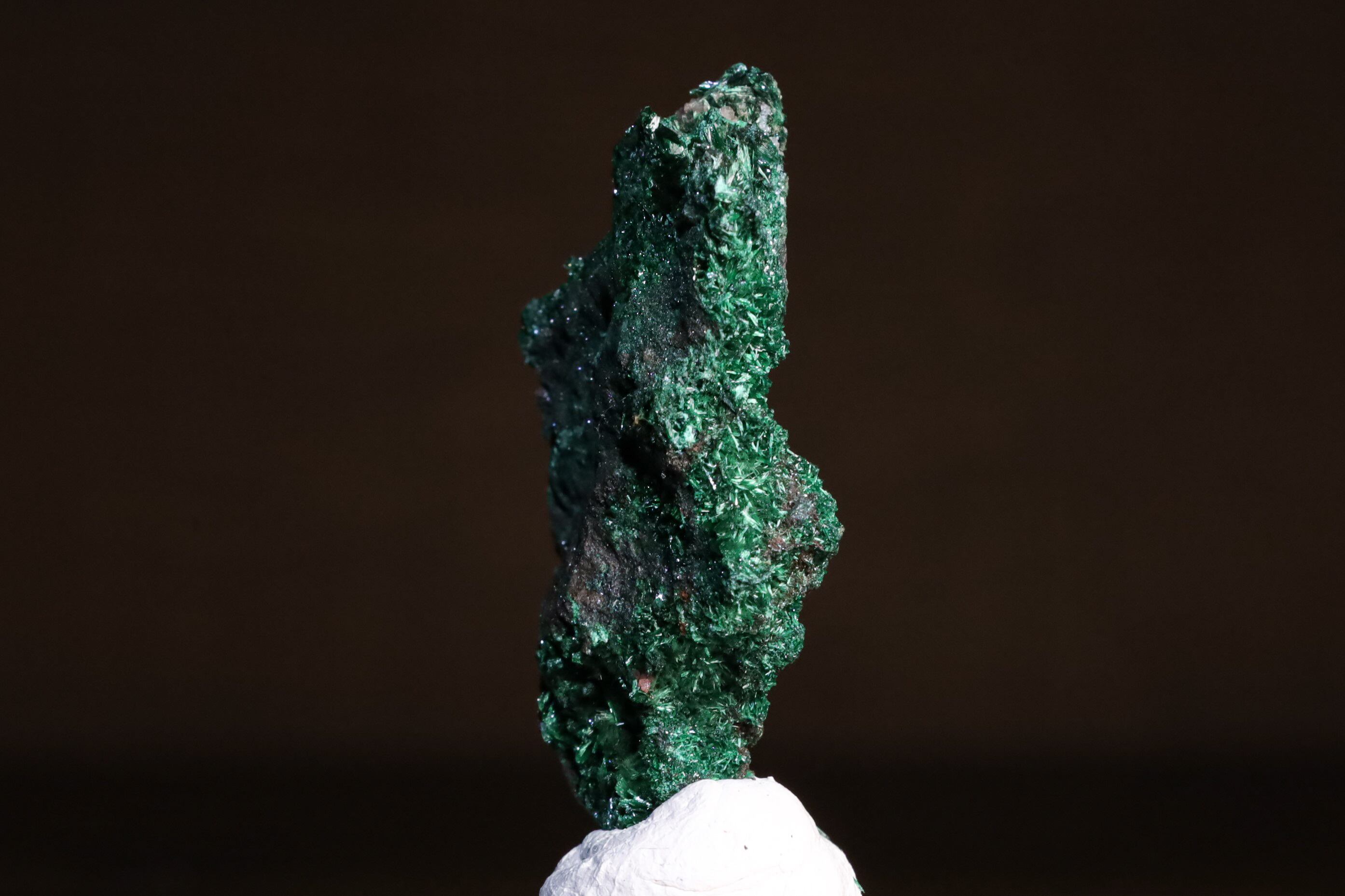 こちらはナミビア、Kombat Mineから産出した、鮮やかな緑色を放つMalachiteが鉄・マンガン酸化鉱物の母岩上に結晶した標本で、通常光下では3枚目の画像のような感じにも見えますが、自然が生み出した重みある造形や光沢がいい感じで、光源直下ではメイン画像のような、美しい色味の光沢が見られます。